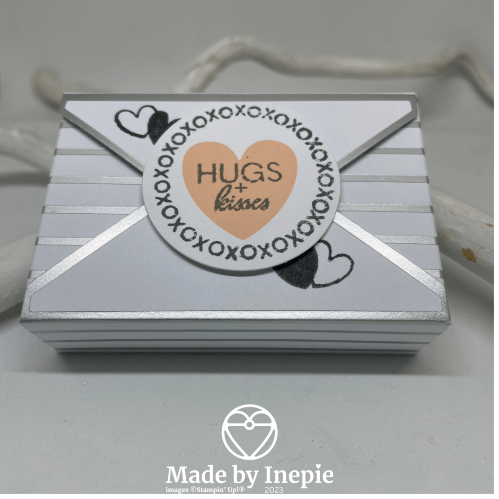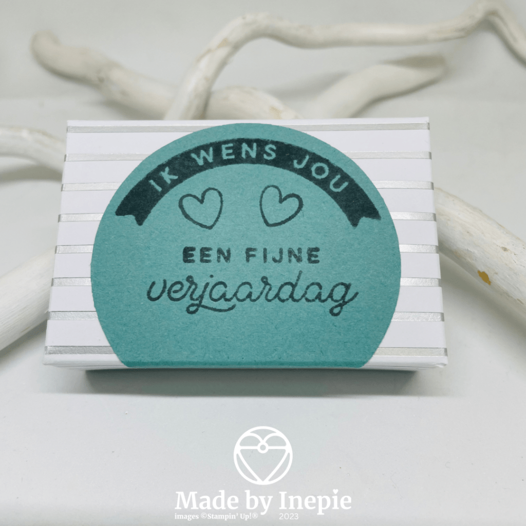 Er zit een stempelset bij, clear blok, inkt spot in Basic Gray, stickers, een hele complete kit dus. En ik heb deze gecombineerd met de bundel een Rondje Gelukswensen die deze week in de hoofdrol stond.. Ik heb een cirkel uit Lost Lagoon cardstock geponst en met mijn scoring board op 1cm een lijn gerild. Toen de teksten erop gestempeld en de hartjes uit de stempelset van de kit. De cirkel heb ik met liquid glue op het doosje geplakt.