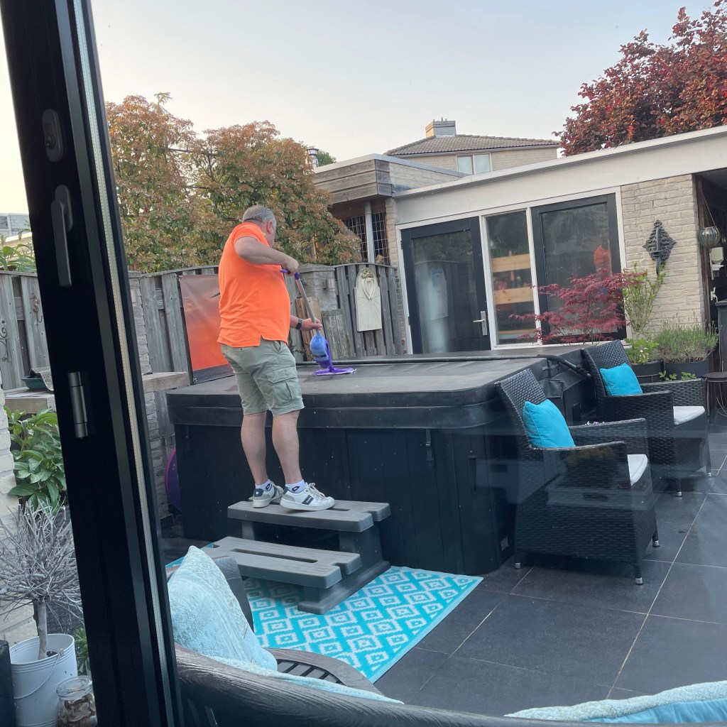 Willem is bezig om de plaats weer schoon te krijgen, dat woestijnzand is echt niet leuk. En de bloesems van de bomen van de buren maken ook een zooitje. Hij vindt mijn Swiffer apparaat geweldig. Hij maakt er nu ook de kap van de jacuzzi mee schoon.