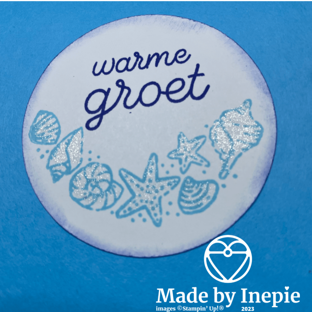Ook de schelpen heb ik van een glitter laagje voorzien. Dat geeft toch net wat extra’s. Gelukkig vond mijn swapmaatje het een mooie kaart. En krijgen we morgen een nieuwe uitdaging.