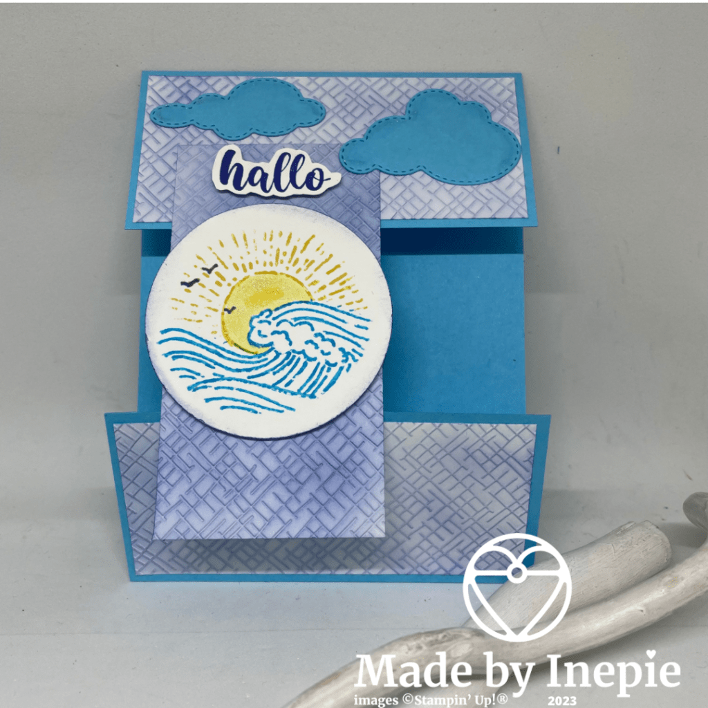 Maar op dit moment heb ik maar twee soorten in huis. Dus heb ik stukken Basic White door de basis Embossing folders gehaald, dit is een online only product en in mijn webshop te verkrijgen. En daarna kleur met een Blending Brush aangebracht. De stempelset Een rondje gelukwensen heb ik hiervoor gebruikt want die stond toen in de hoofdrol. Helaas was mijn swap maatje niet thuis en kom ik hem dus nog niet plaatsen.