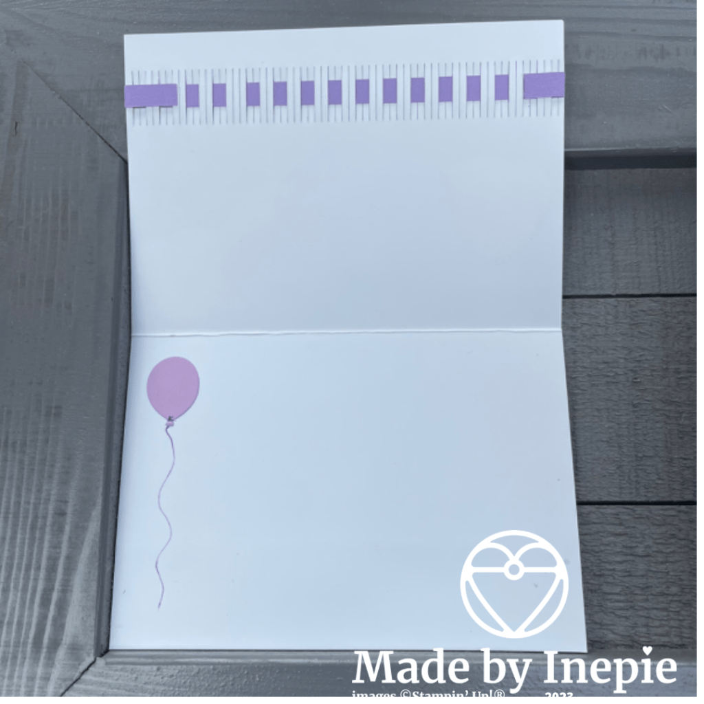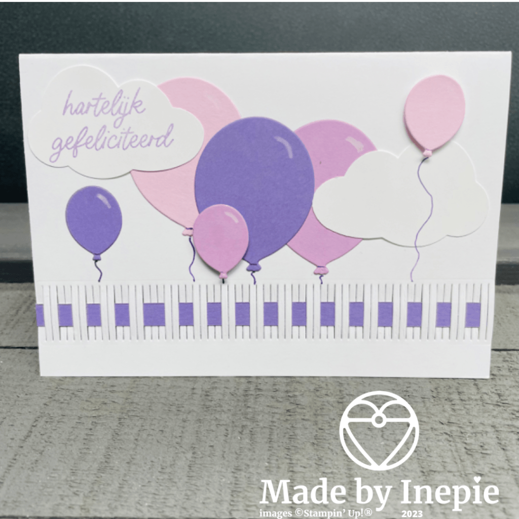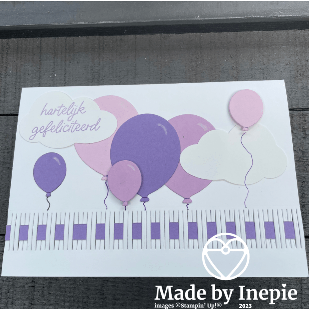Met de drie kleuren die ik uitgezocht had : Highland Heather, Fresh Fresia en de nieuwe kleur Bubble Bath heb ik ballonnen uitgestanst en deze op de kaart geplakt. Met de wolkenpons twee wolken uitgeponst en bij 1 de tekst uit de stempelset erop gestempeld. Met een Stampin Write Marker de touwtjes getekend. Lief kaartje toch? Kan zelfs als babykaart gebruikt worden.