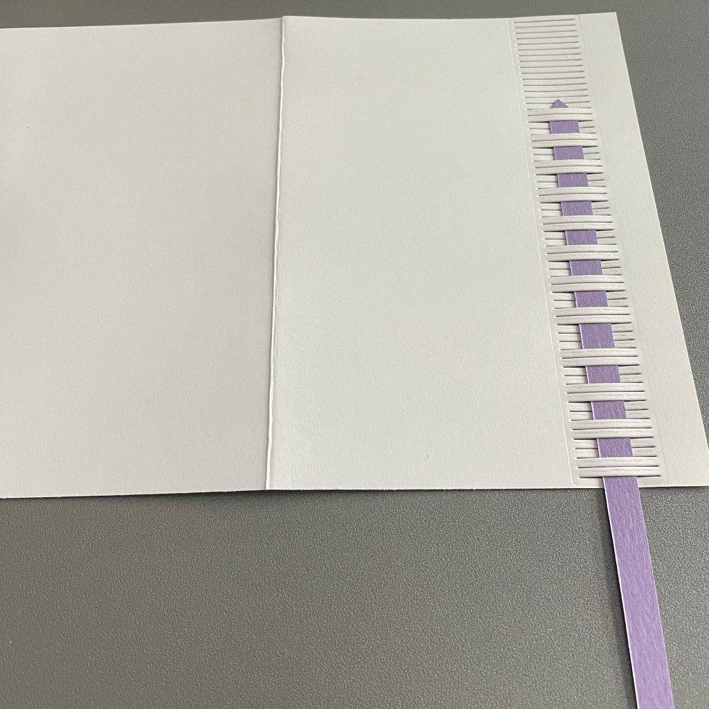 Ik zag die stans erin zitten en ik dacht eh, wat moet ik daarmee. Ik dacht eerst dat je er een rozet of zo mee kon maken maar nee het stanst gleufjes uit. Super leuk dus ik dacht dat is grappig met een stukje cardstock als een soort lint erdoor. Zoals je op de foto ziet heb ik een punt geknipt aan het strookje van 1 cm dan gaat het makkelijker door de gleuven heen. Grappig effect toch?
