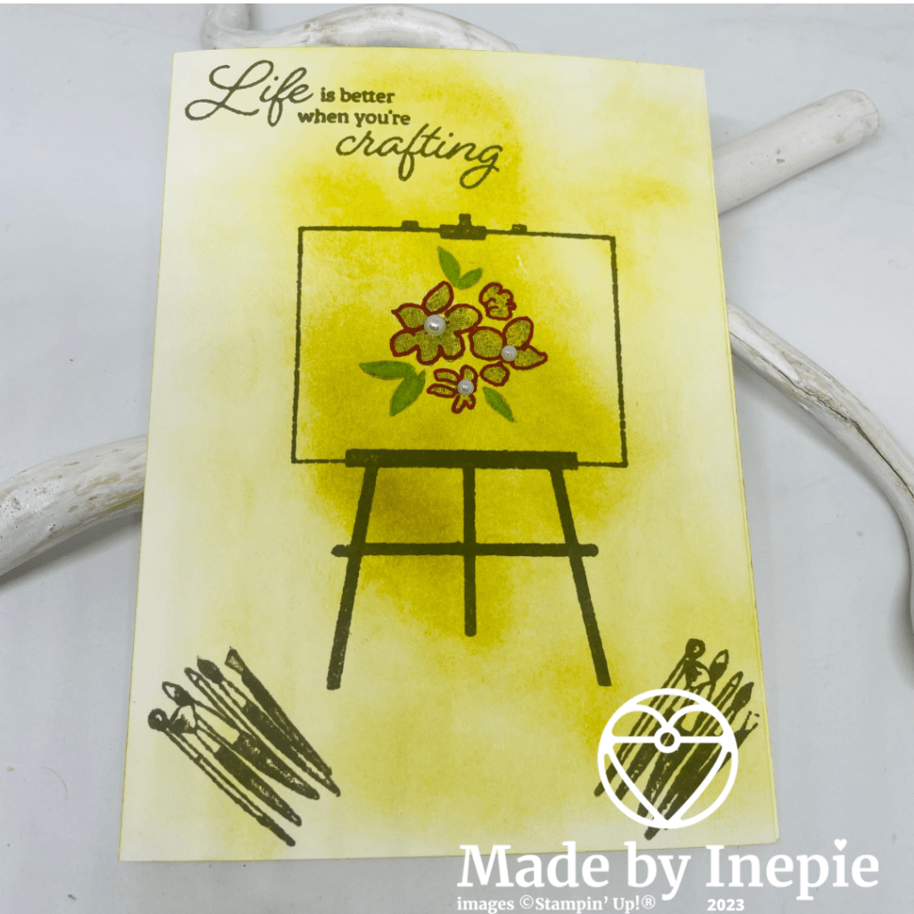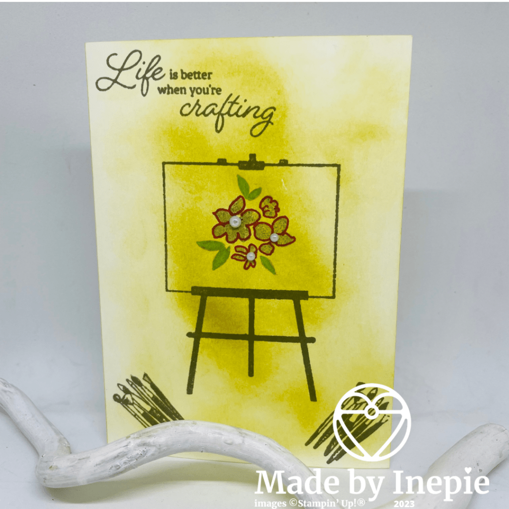 Voor het Makkelijke Maandag kaartje heb ik een Basic White basiskaart gepakt. Met de nieuwe In Color Wild Wheat en een mini Blending Brush heb ik kleur aangebracht. Ik wilde een artistieke achtergrond maken. Ik was eerst niet meteen weg van deze nieuwe kleur maar als je ermee stempelt lijkt het een beetje op goud. Dus nu ga ik hem zeker vaker gebruiken.