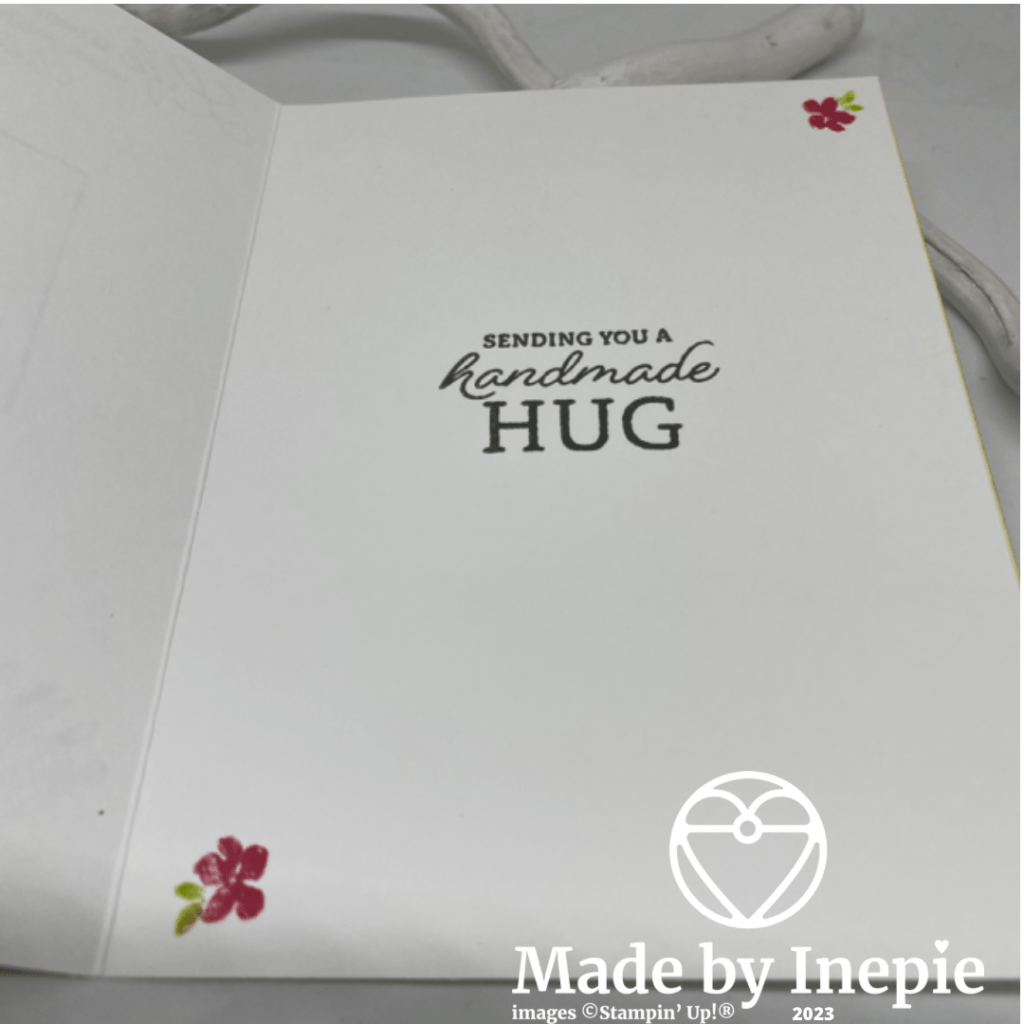 Het kaartje is heel eenvoudig. Ik heb gestempeld met de andere nieuwe In Color: Pebbled Path. Deze vond ik meteen mooi. Is iets zachter dan zwart. De tekst en de bloemen komen ook uit de stempelset. Met de bijbehorende markers heb ik de bloemen wat ingekleurd. Ik gebruikte de andere In Color kleuren van 2022-2024 : Parakeet Party en Sweet Sorbet. De bloemen had ik eerst twee keer afgestempeld.