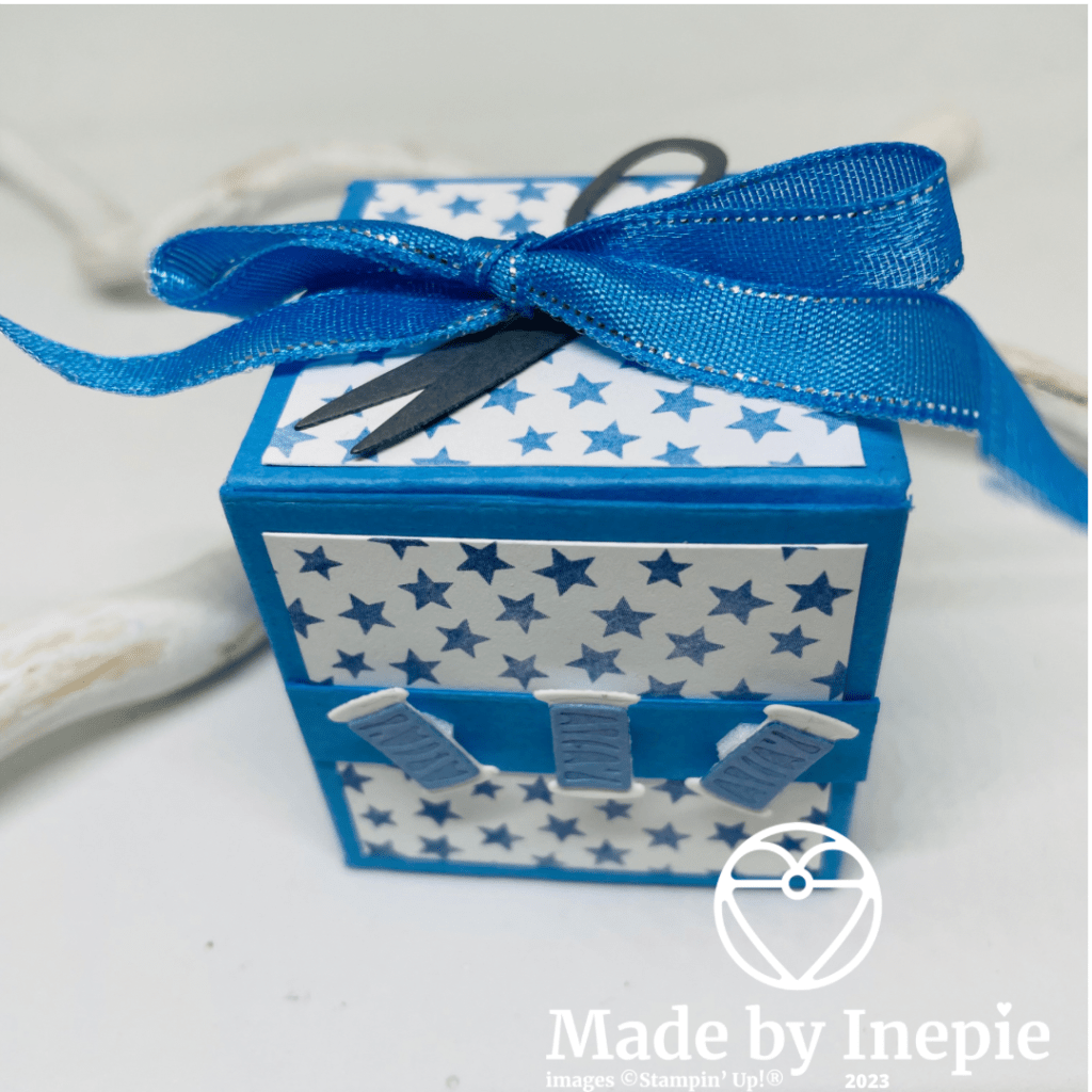 Met de bundel Crafting with You in de hoofdrol deze week wilde ik de schattige klosjes garen stansen laten zien. De schaar had ik al eerder gebruikt want die vind ik zo leuk! Dit model doosje hoef je niet te lijmen het blijft goed dicht zitten maar een strik erom staat wel feestelijk. Zo lijkt het echt een cadeautje.