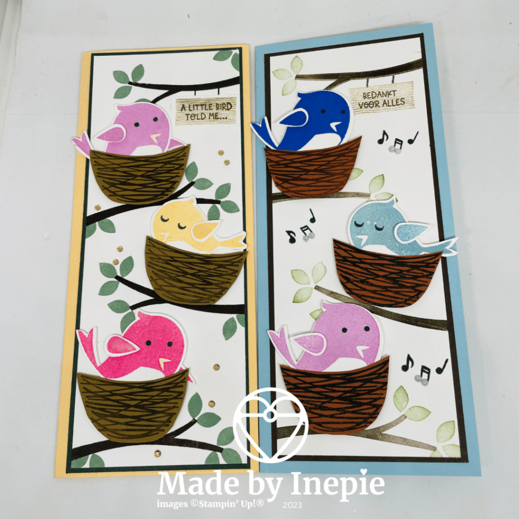 Links zie je Astrid’s kaartje en rechts dus de mijne. Leuk om ook weer een keer een Slimline kaart te maken. De basis kaart is 18 cm bij 21 cm gerild op 9 cm. Daarop heb ik een mat van 8cm x 20cm geplakt en daarop kwam een Basic White mat die ik eerst had bestempeld en beplakt. Ik heb voor de vogels en de vleugels mijn Stamparatus gebruikt. Dat werkt het fijnste. Ik heb de muziek nootjes gebruikt en daar wat parels opgeplakt voor de Blingbling.