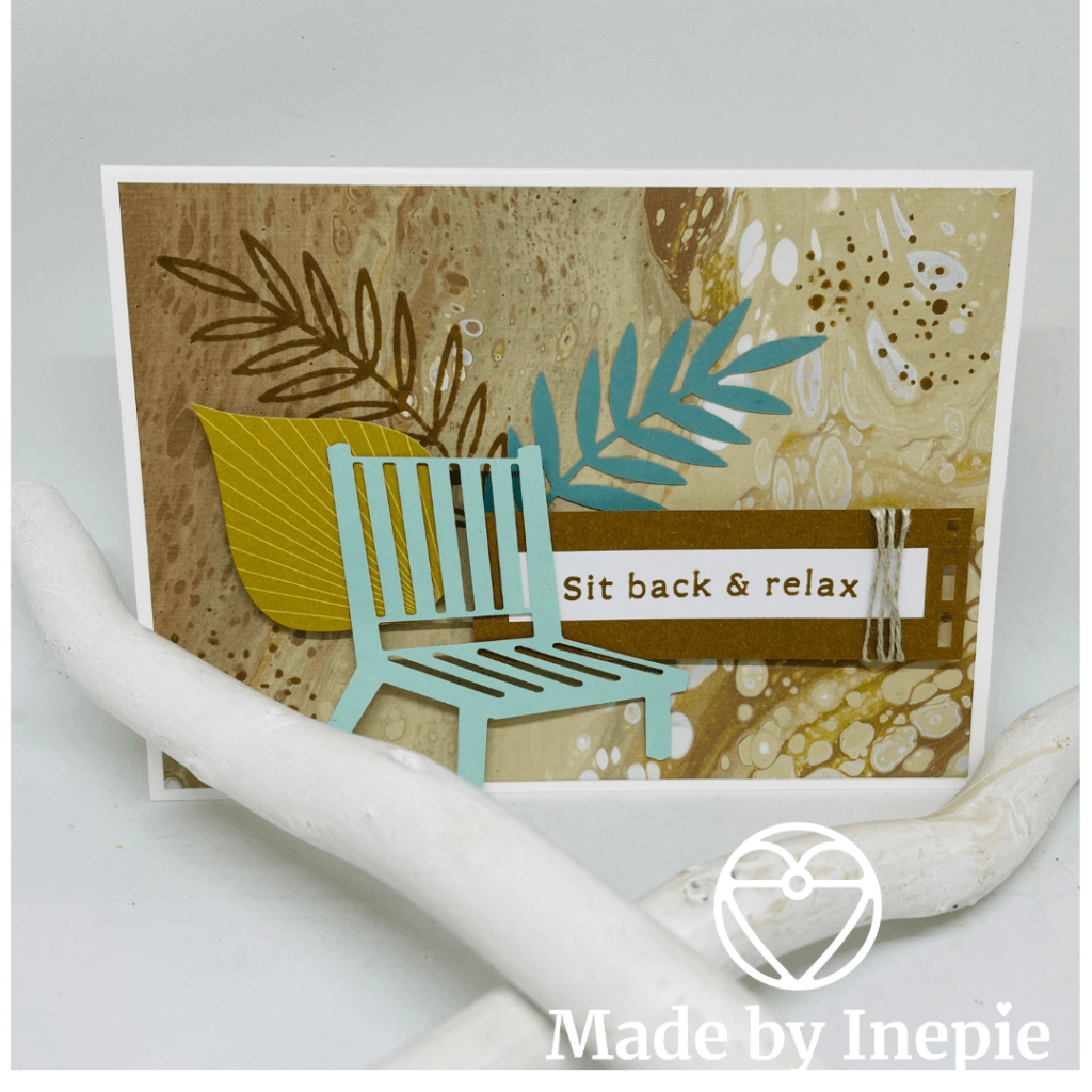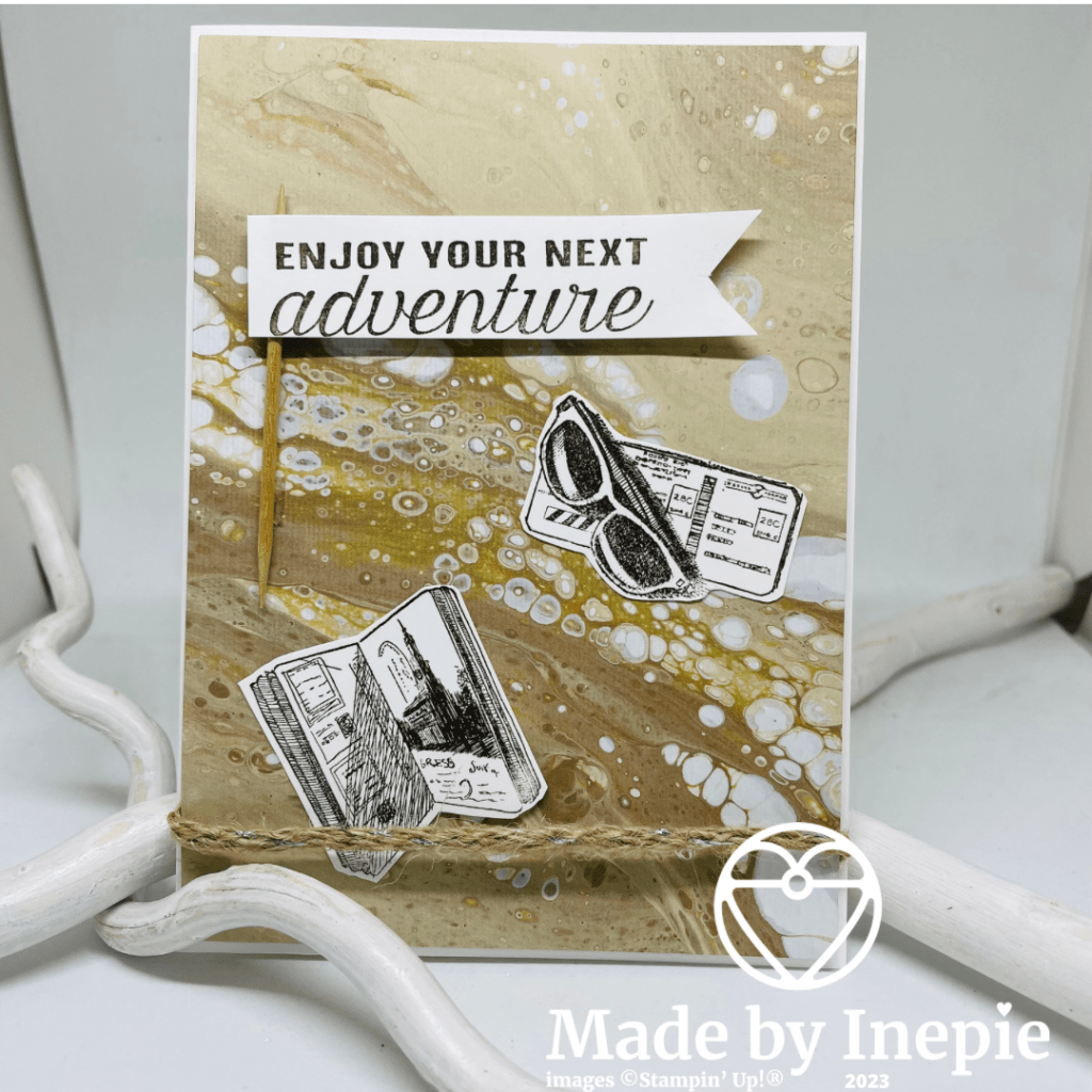 Ik heb een normale basiskaart in Basic White gesneden: 14,5 cm bij 21 cm. Van de kaart uit de kit heb ik een mat gesneden van 10 bij 14 cm. 3 Stempels uit de Next Destination stempelset gestempeld met Early Espresso inkt op reststukjes Basic White. En deze uitgeknipt en gesneden. Een stuk Silver Threaded Twine vastgeplakt op de achterkant en toen de mat met Dimensionals op de basiskaart geplakt. Een houten prikker met gluedots op de mat bevestigd. De tekst vlag met Dimensionals opgeplakt en de punten wat omhoog gekruld. De twee andere stempels plat op de kaart geplakt. Omdat de mat al zo mooi is ( acryl Pouringeffect) heb ik geen blingbling toegevoegd. Stoer kaartje toch?