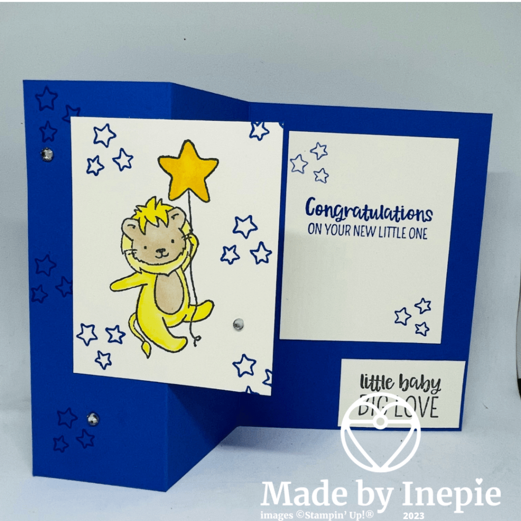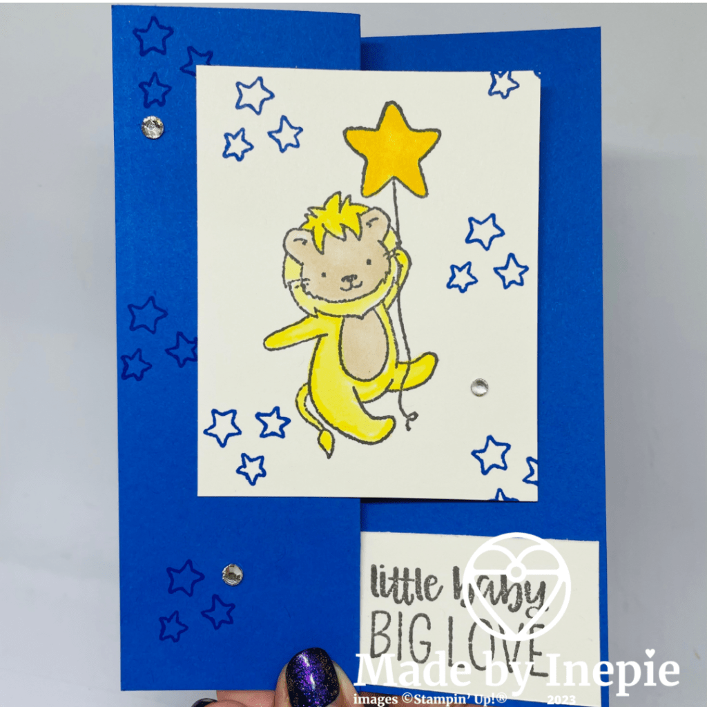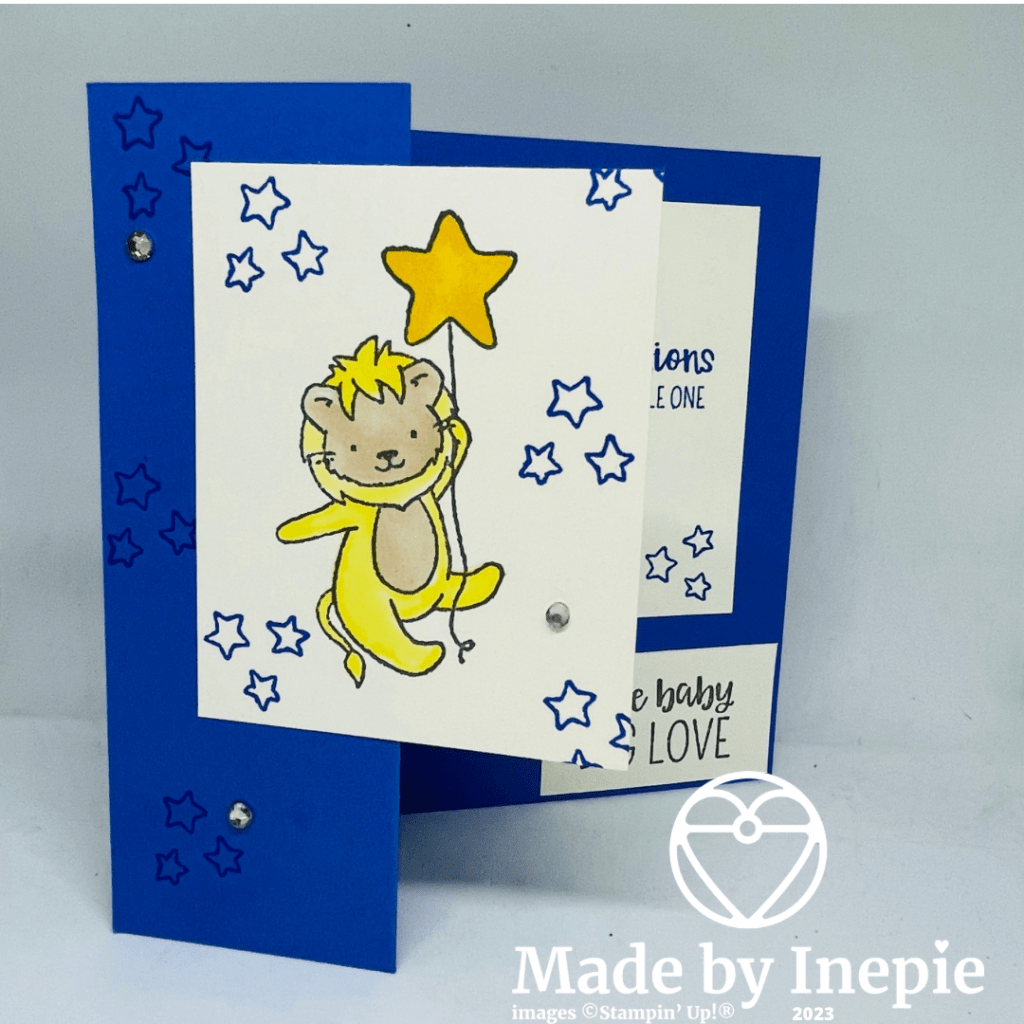 De basiskaart is in Orchid Oasis. De sterretjes heb ik met de Orchid Oasis inkt gestempeld. En het leeuwtje heb ik ingekleurd met Stampin Blends.