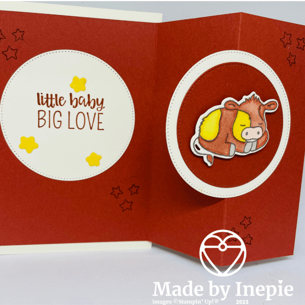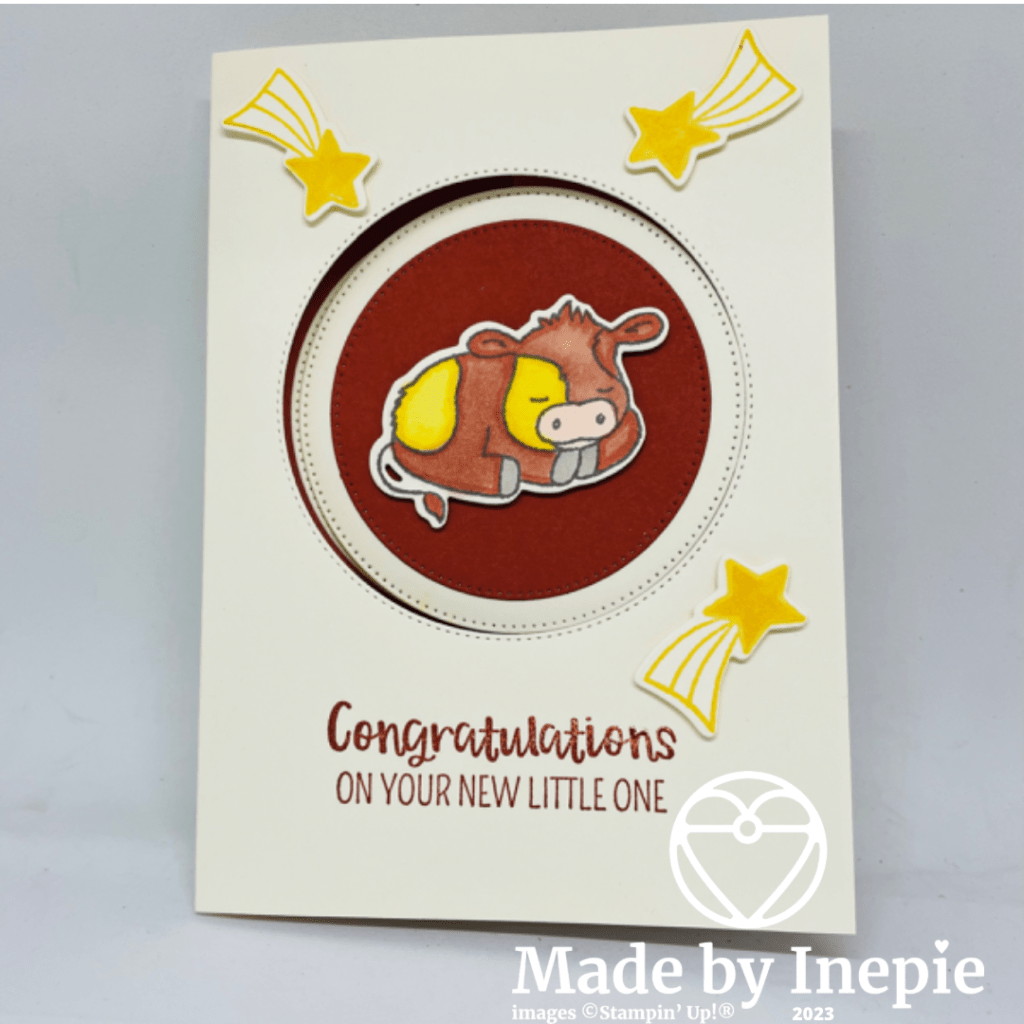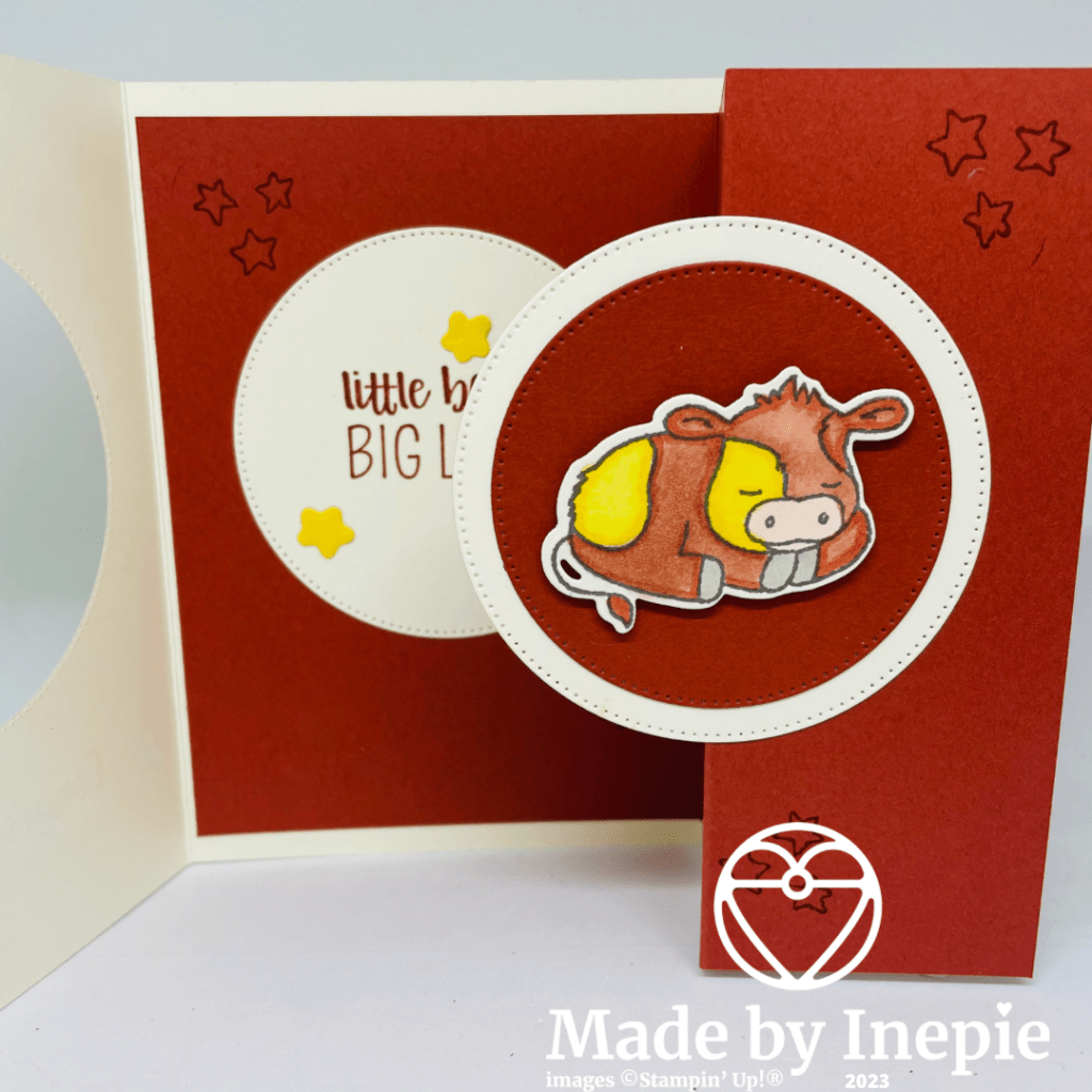 Met de 1 maat kleinere stans heb ik een cirkel gestanst uit Cajun Craze cardstock. En daar het koetje met Dimensionals opgeplakt. Het koetje had ik op een reststukje Verry Vanilla gestempeld met Basic Gray inkt en daarna het ingekleurd met mijn Stampin Blends. Toen de bijbehorende stansen gepakt en het koetje uitgestanst: easypeasy!