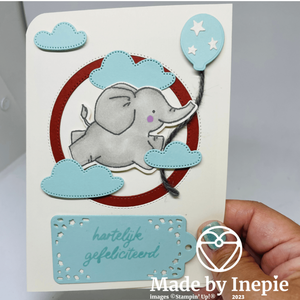Het is toch net alsof het olifantje aan de ballon door de wolken zweeft. Ik heb er alleen Hartelijk gefeliciteerd opgestempeld, dan kan ik hem als verjaardags kaartje of als geboorte kaartje gebruiken.