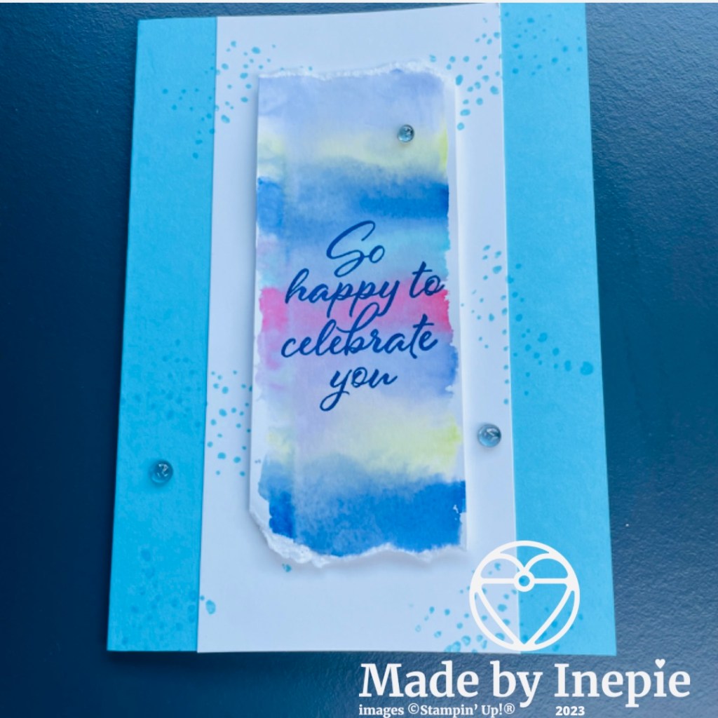 Op een basis kaart van Tahitian Tide heb ik eerst een strook Basic White geplakt en daarna uit de losse pols bestempeld. Hierna met Dimensionals de gescheurde strook erop geplakt. Voor de Blingbling heb ik nog 3 Tinsel Gems ( 161624) erop geplakt. Een gemakkelijk kaartje maar heel apart zo met die Watercolor kleuren achtergrond.