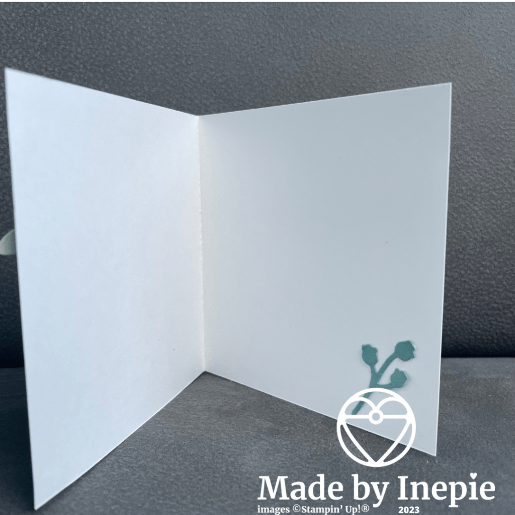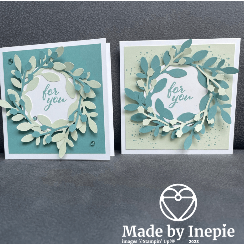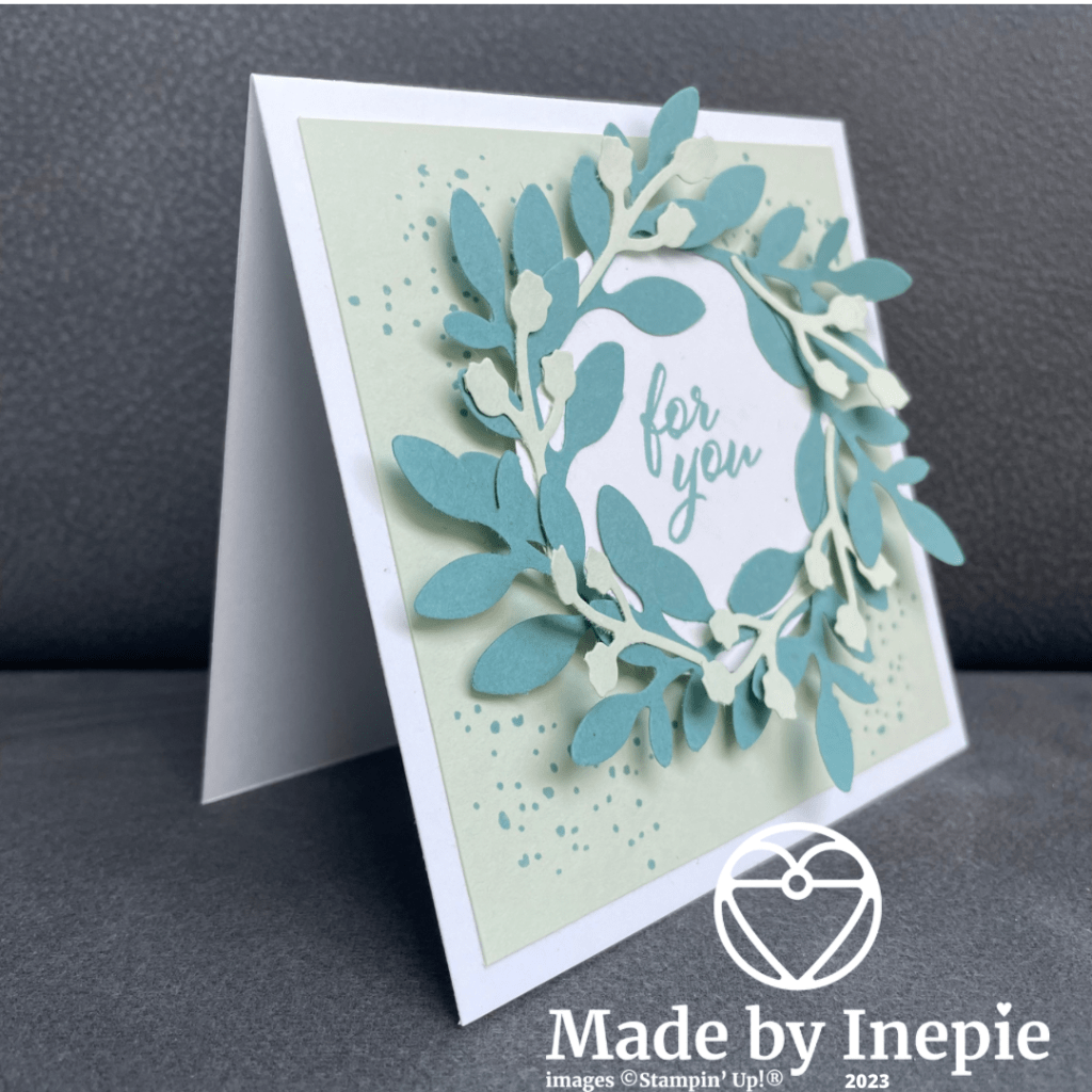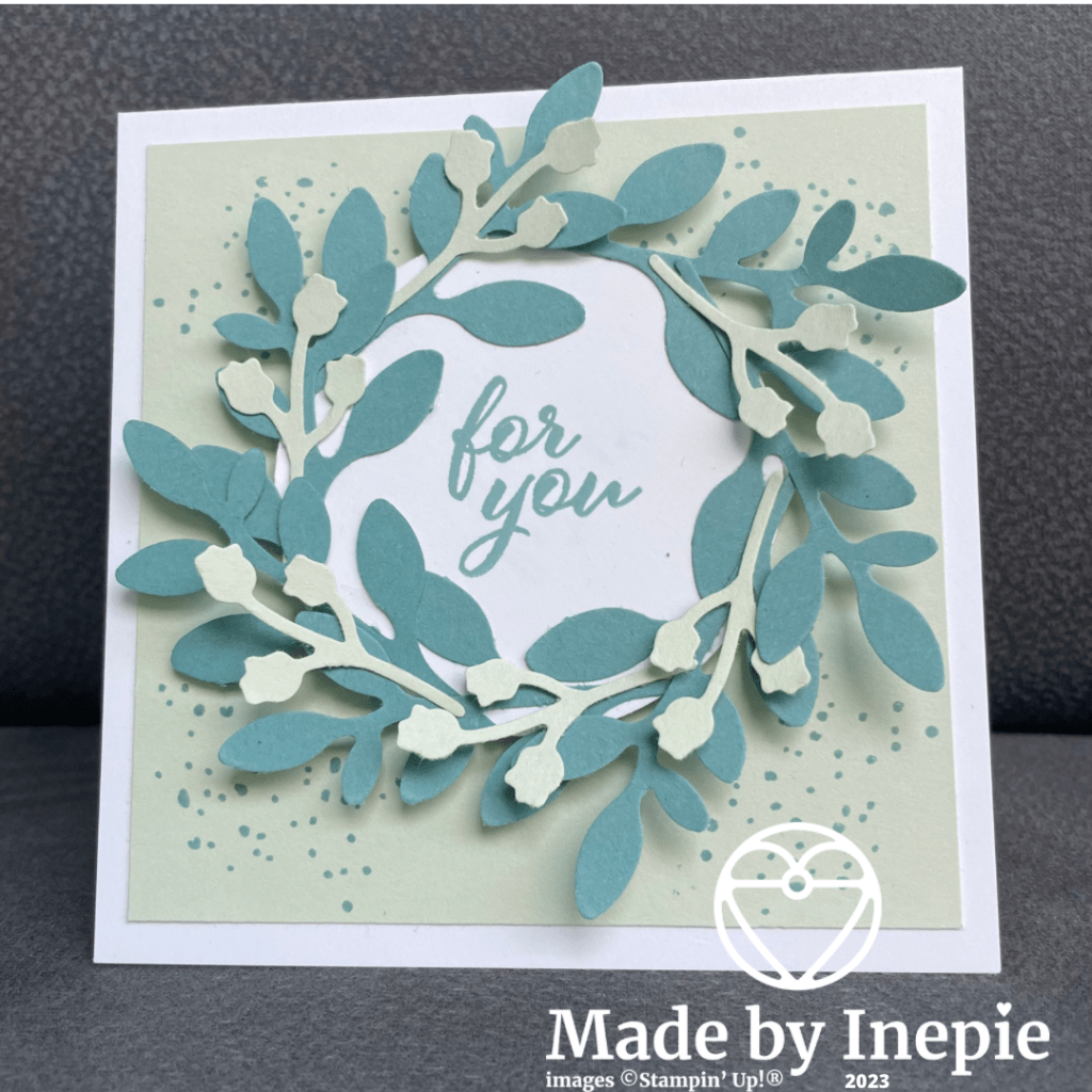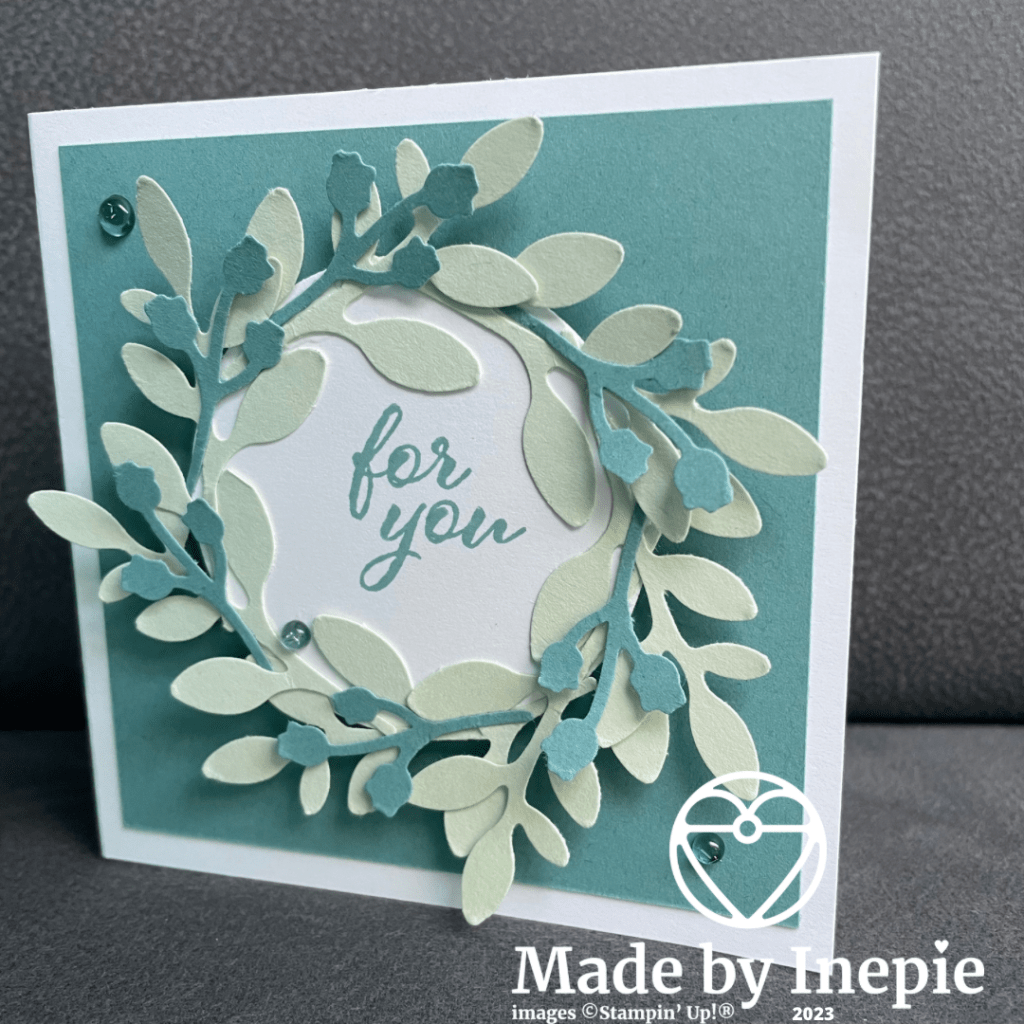 Het tweede kaartje heb ik met de vouw naar boven gemaakt: net weer even anders. En ik heb de Soft Seafoam mat bestempeld met Lost Lagoon inkt. Daarna de krans er weer opgeplakt met Dimensionals en weer een mooi kaartje af. Deze is al op weg naar de ontvangster. Omdat er For You op staat kan dit voor alle gelegenheden gebruikt worden.