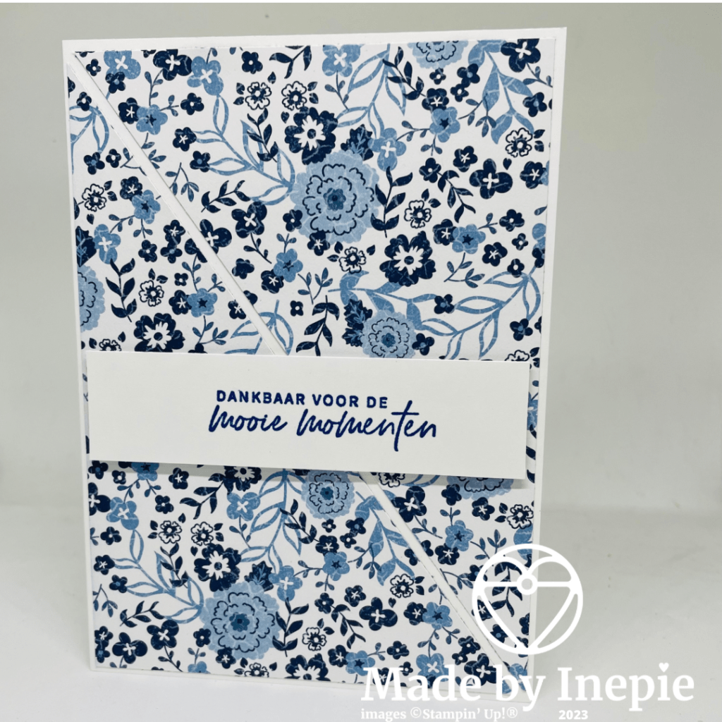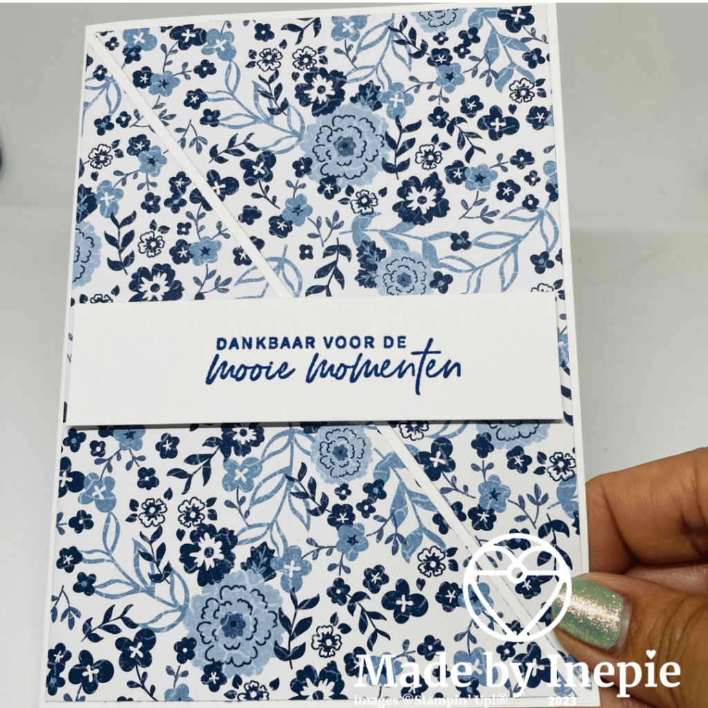 Voor vandaag heb ik een heel eenvoudig kaartje. Alleen een mat Dsp van 10 cm bij 14 cm diagonaal doorgesneden en opgeplakt op de Basic White basiskaart van 14,5 cm bij 21 cm. Met een klein stukje ruimte er tussen. En dat geeft een heel mooi subtiel effect.