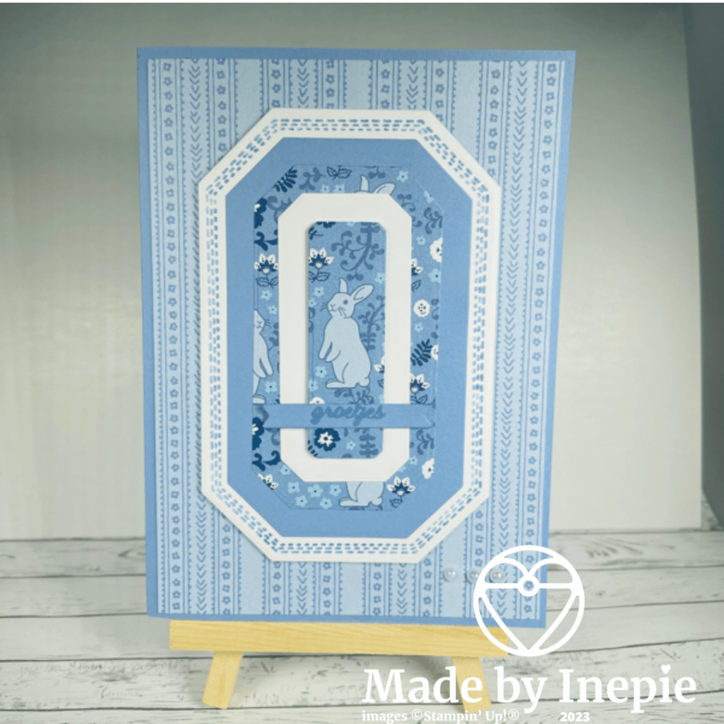 Vandaag heb ik voor de eerste keer de CountrySide Corners stempel gebruikt. Ik heb hem in mijn Stamparatus gefaan en met de Boho Blue Stampin Write Marker van inkt voorzien. Daarna dit uitgestanst. Toen uit Boho Blue cardstock de maat kleiner uitgestanst. Daarna een uit het Dsp toen 1 uit Basic White en daarna nog 1 uit het Dsp want ik vond dat konijntje zo lief. Een beetje Beatrix Potter gevoel krijg ik hierbij.