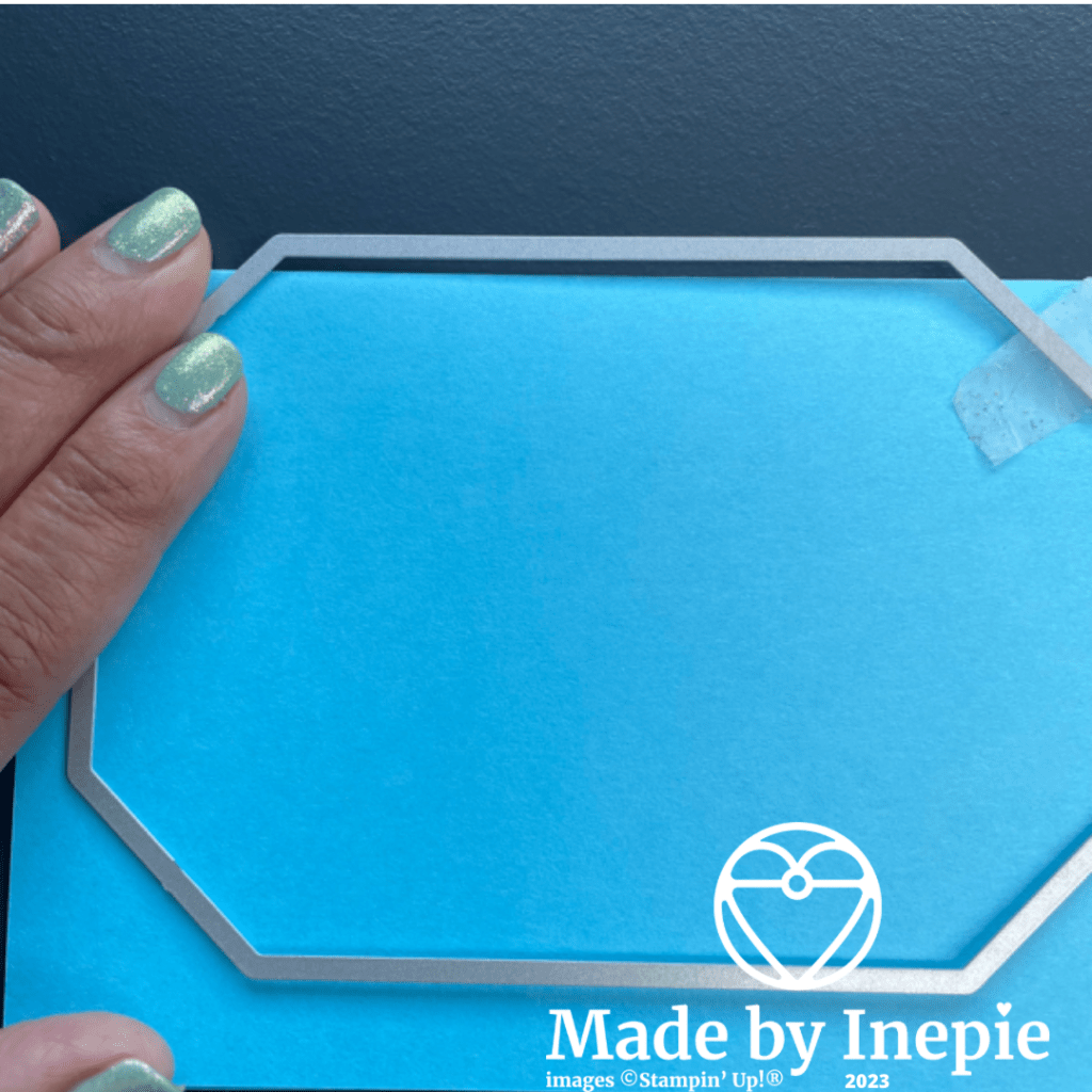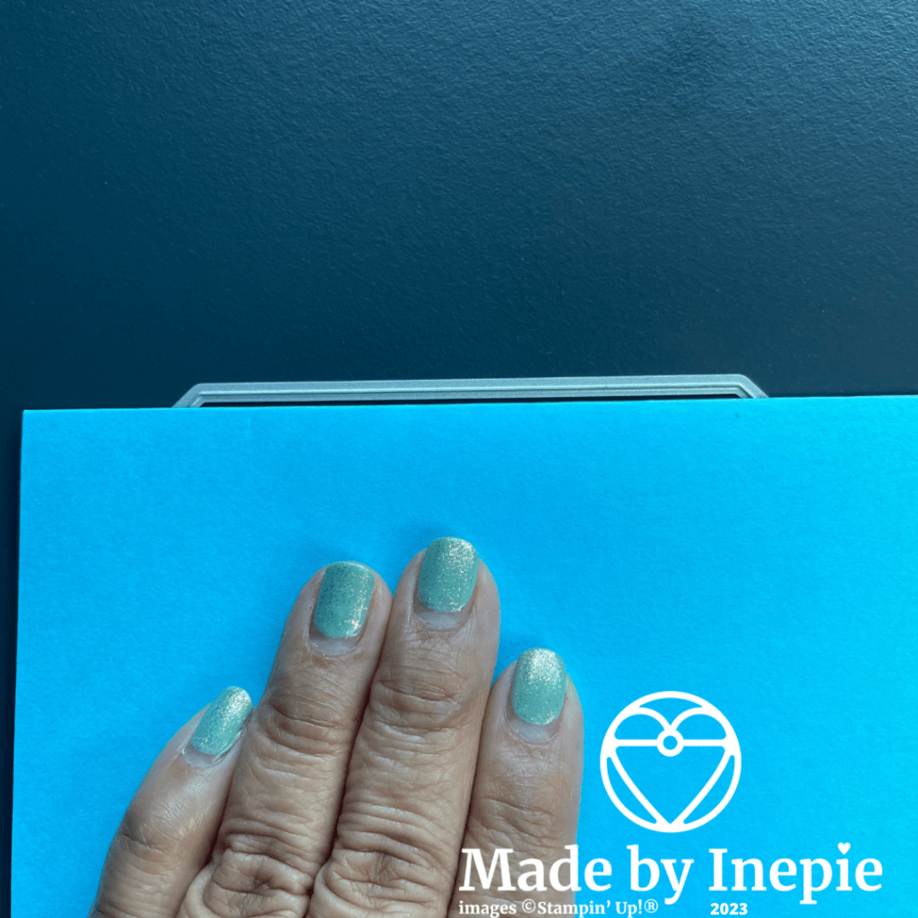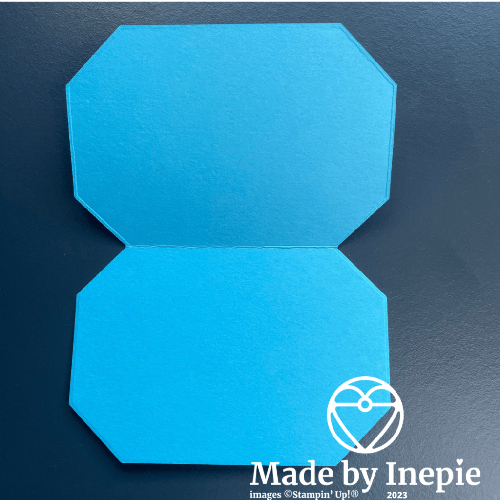 Met de grootste stans van de CountrySide Corners Dies heb ik de kaart uit gestanst. Hoe doe je dat? Ik heb een stuk Tahitian Tide cardstock van 14 cm bij 20 cm gesneden en gerild op 10 cm. Daarna heb ik de grootse stans net over de vouw gelegd. Zodat de snijrand net buiten het cardstock valt.