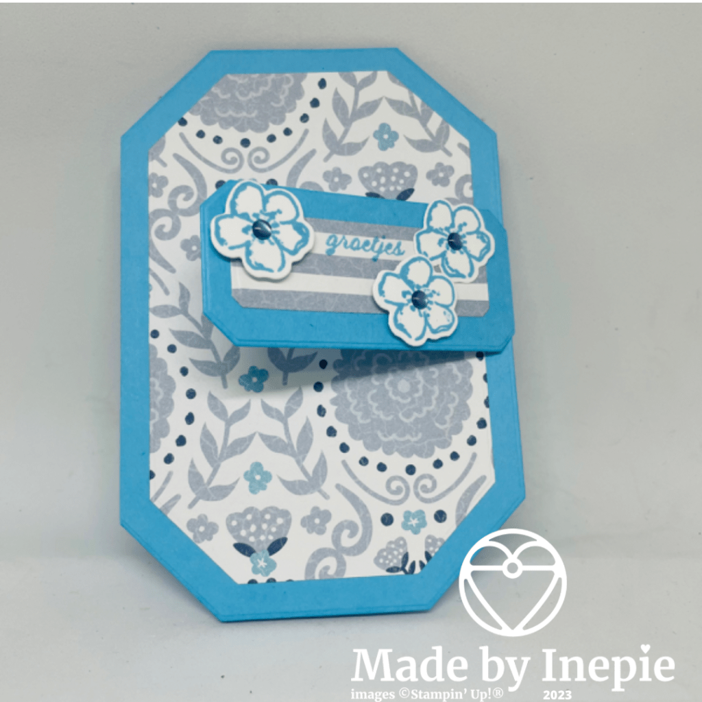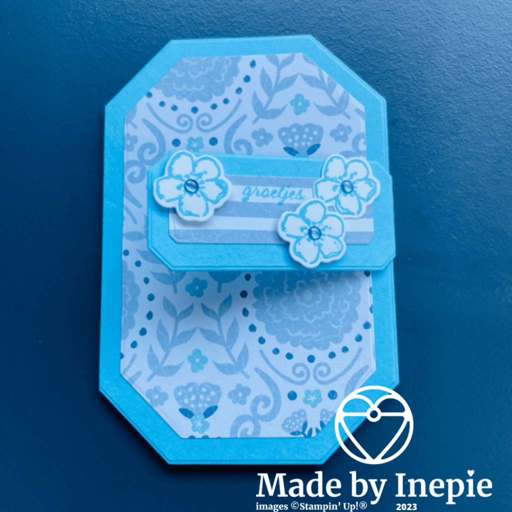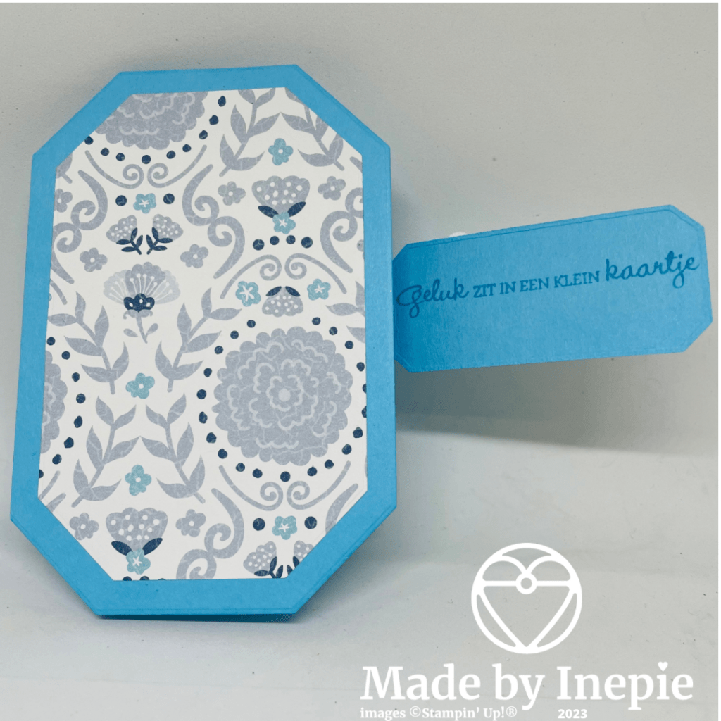 Uit het Dsp de daaropvolgende stans gesneden en deze op de basiskaart geplakt. Dat zag er al leuk uit maar ik bedacht om met de kleinste van de serie stansen het zelfde te doen. Stuk cardstock vouwen en het stansje weer net boven de vouw leggen en uitstansen. Deze heb ik aan de binnenkant van de kaart geplakt en als een soort sluiting gebruikt.