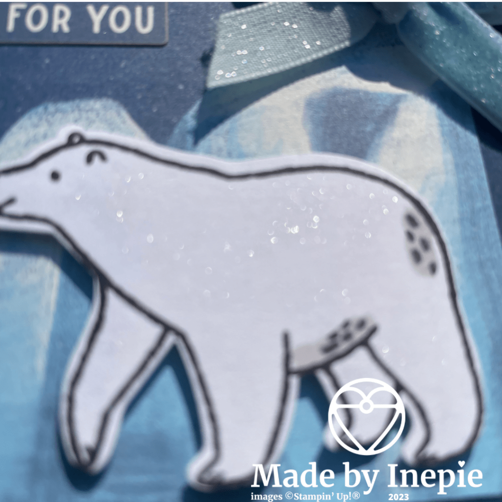 Ik heb de stempelset en de pons gebruikt. Het Dsp, de Adhesive Baked Glitter Sequins en het mooie Balmy Blue Sparkle Ribbon. Om de beer ook wat sparkle te geven heb ik er Wink of Stella op gedaan. Was moeilijk om het op de foto te laten zien.