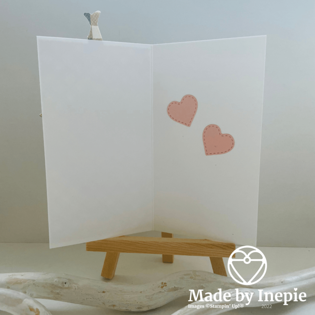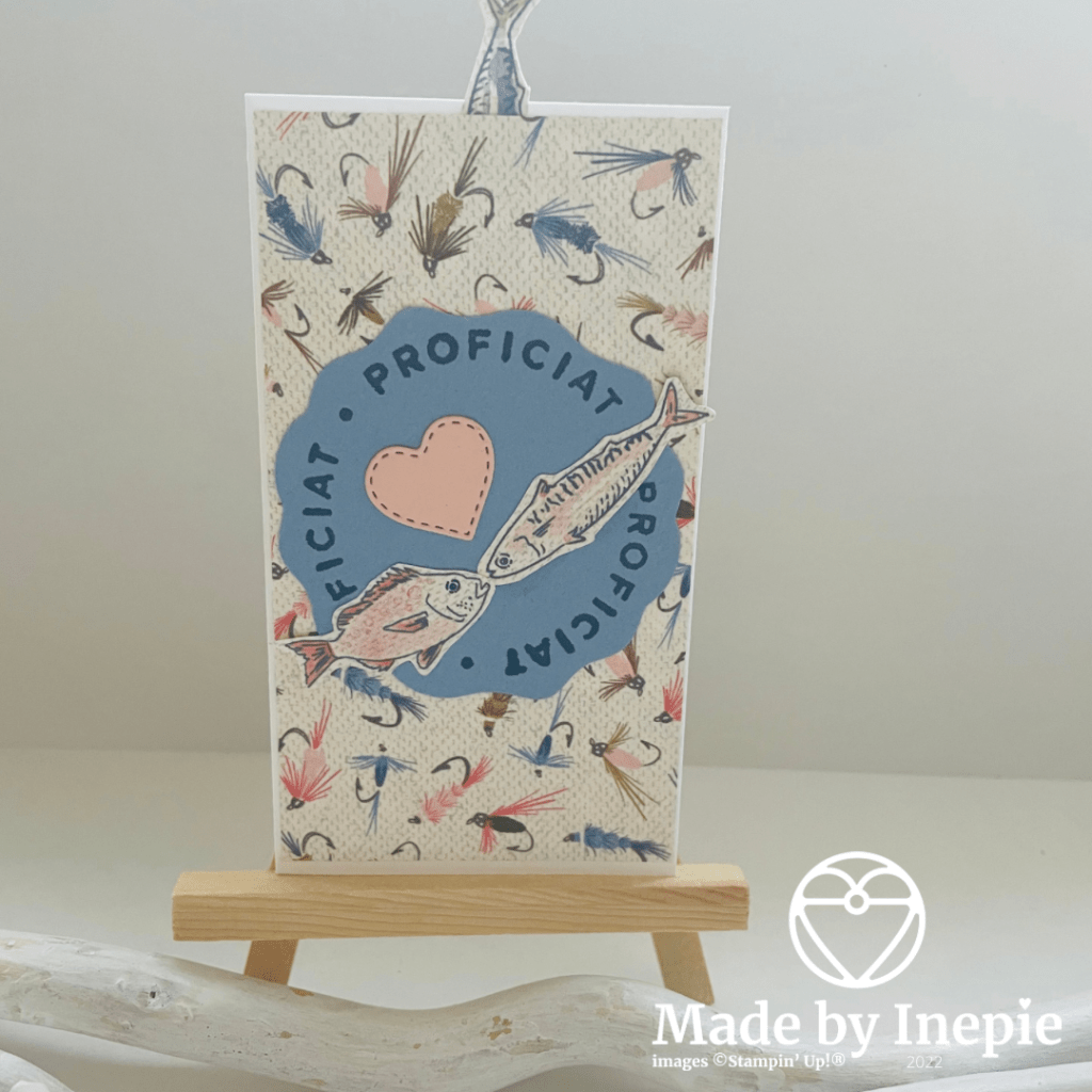 Daarna weer Proficiat gestempeld met de “Een rondje gelukwensen” stempelset en deze weer uitgeponst met de Decorative Cirkle pons. Twee vissen uit mijn bakje erop geplakt alsof ze elkaar een kusje geven en een hartje die ik met de Give it a Whirl stansen heb uitgestanst. Twee hartjes heb ik ook aan de binnenkant geplakt.