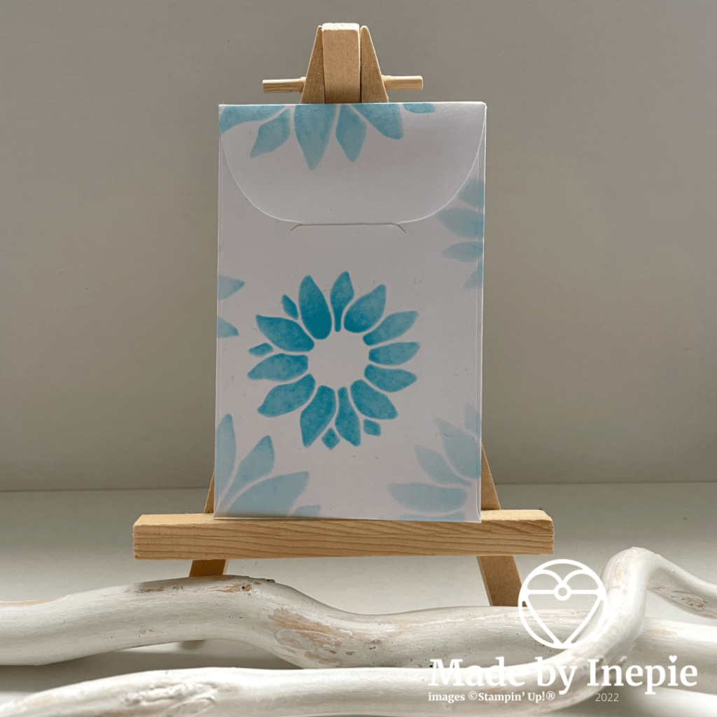 In de mini catalogus op bladzijde 62 en 76 vind je deze mini envelopjes. Super leuk om een cadeau kaart zo te geven, of geld maar je kunt er ook een mini kaartje in stoppen. Het kaartje heb ik gemaakt van een stuk Basic White van 10,6 cm bij 8,5 cm gerild op 5,3 cm.