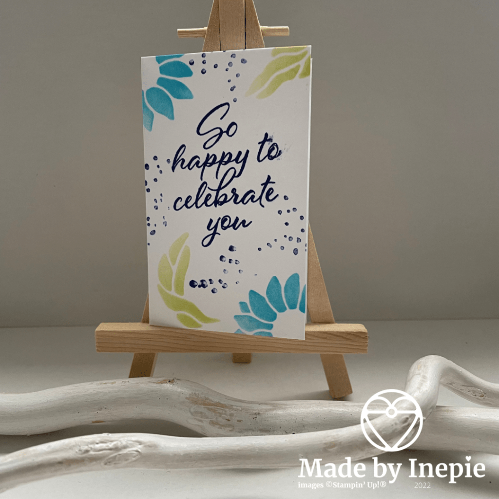 En zo zie je dat het kaartje er goed in past. Ik had eerst 11 cm genomen maar dan kreeg je het kaartje er bijna niet meer uit vandaar dus de 10,6 cm. De teksten en de spikkeltjes komen uit de stempelset Layering Leaves.
