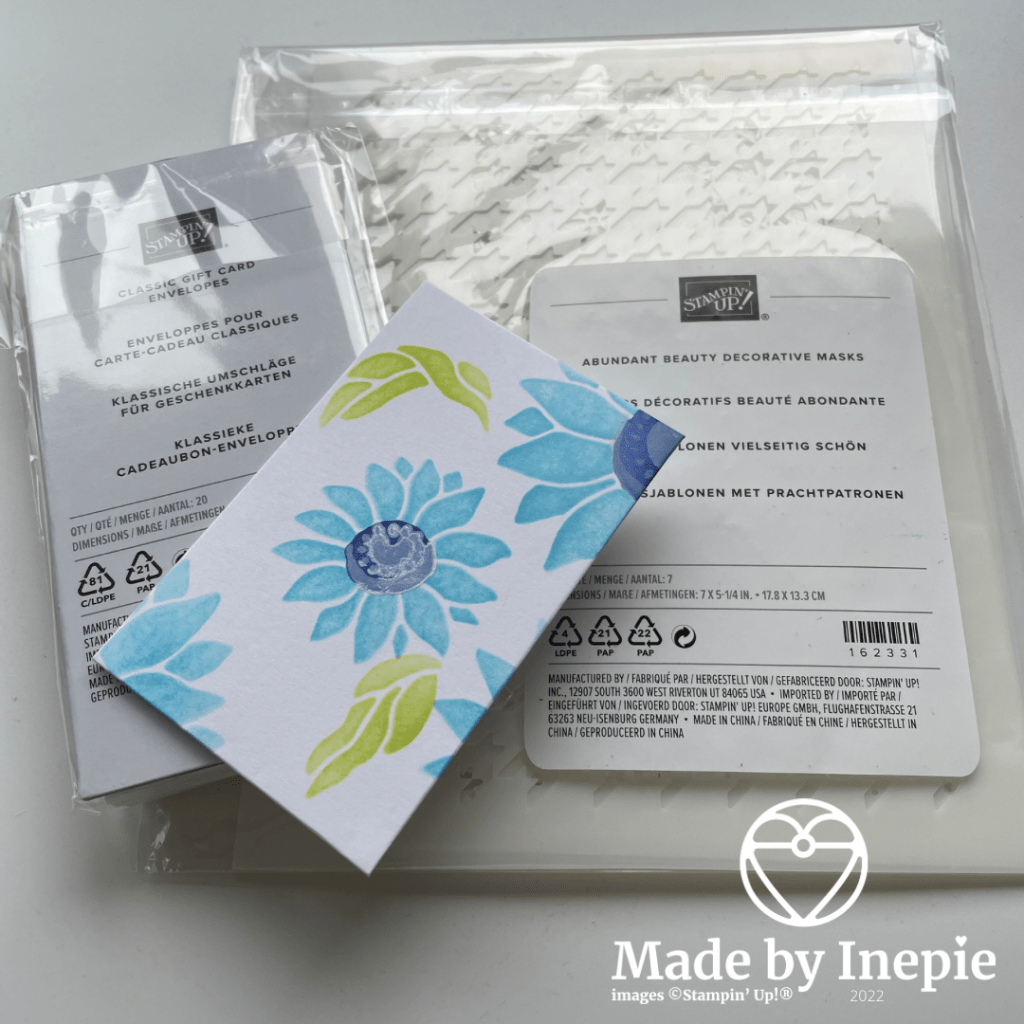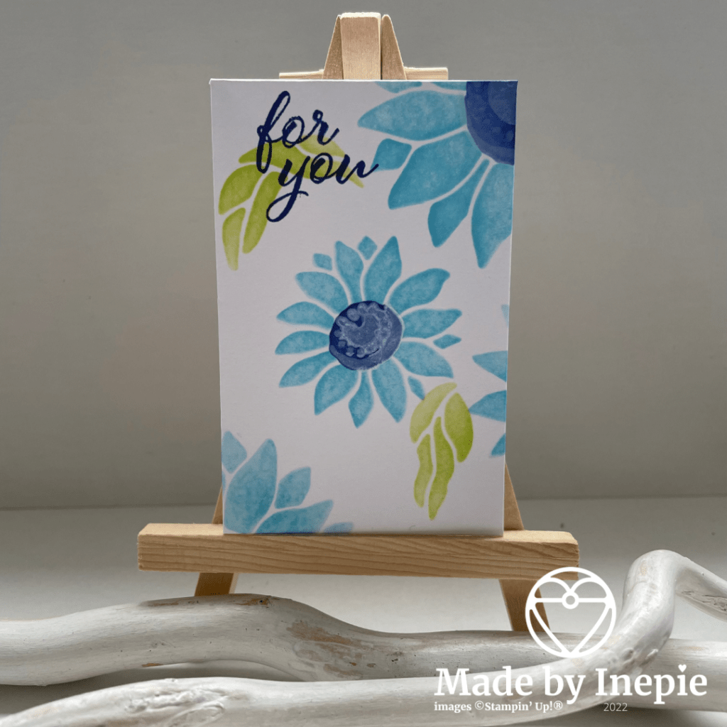 Ik heb nu eindelijk met de Abundant Beauty Decorative Masks kunnen spelen. Zo leuk om te doen. Het zijn eigenlijk zonnebloemen maar ja ik hou nu eenmaal van blauw. Ik heb gekozen voor drie In Color kleuren van 2022-2024: Tahitian Tide/Parakeet Party/ Starry Sky en wat White Craft inkt.