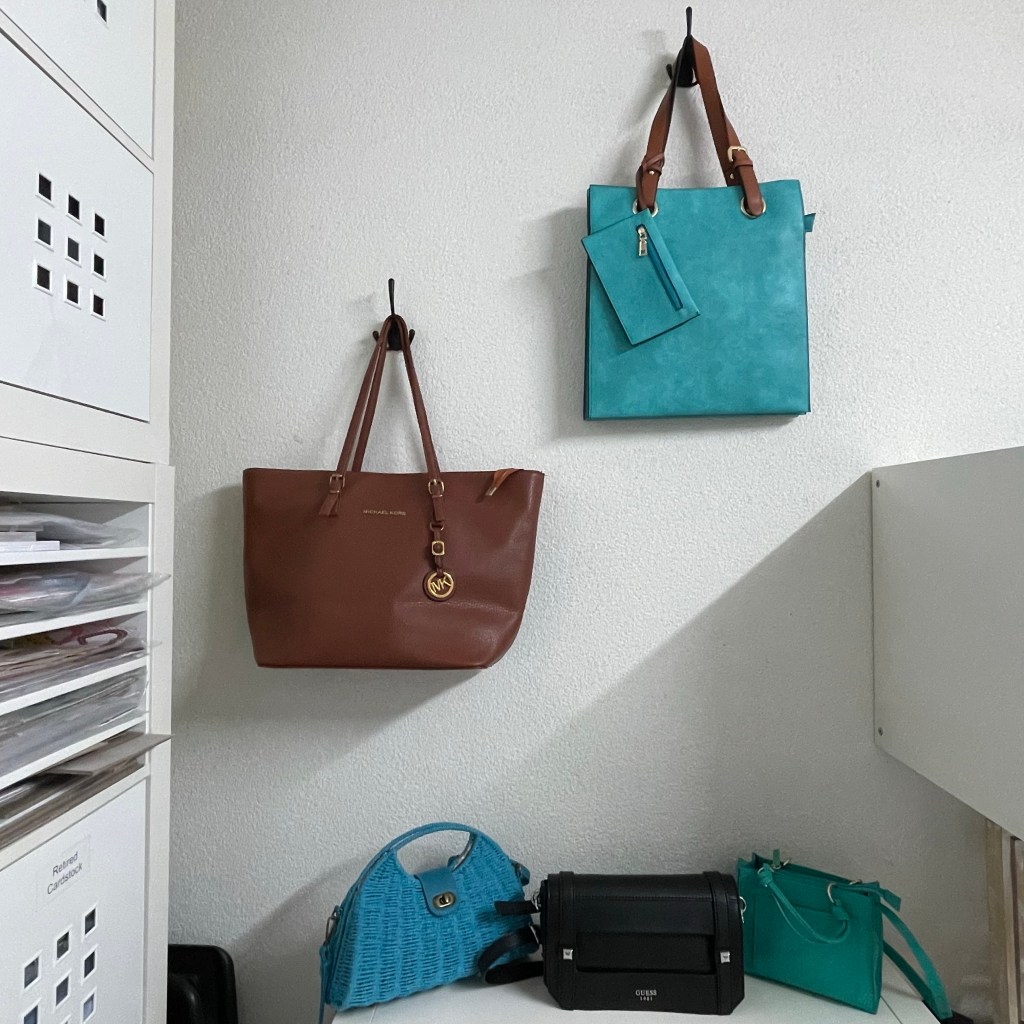 Vandaag was Willem vrij en hebben we wat klusjes gedaan. Nou ja wij: ik hield de stofzuiger vast toen hij ging boren en voor mij kapstok haakjes op hing. Wel waar ik ze wilde hebben natuurlijk hihi. Want en dit heb ik echt van mijn moeder: ik heb een tassen tic! Geen hele dure hoor maar ik vind tassen altijd leuk. Klein of groot, zwart of juist in kleuren ( mijn blauwe kleuren). Laatst kreeg ik van Willem een bruine tas van Michael Kors ( tweedehands). Geen idee of het een echte is en dat boeit mij ook helemaal niet. En de mooie Bermuda Bay tas komt uit Salzburg. Ik zag hem in een etalage en was verliefd: en Willem kocht hem voor mij. En ik had al dat andere schattige rieten Bermuda Bay tasje gehad in Cinque Terre. De zwarte tas is wel een merk tas van Guess en die heb ik ooit van ons mam mogen kopen. En de rechtse koste maar €7,99 en die heb ik echt voor de kleur gekocht.