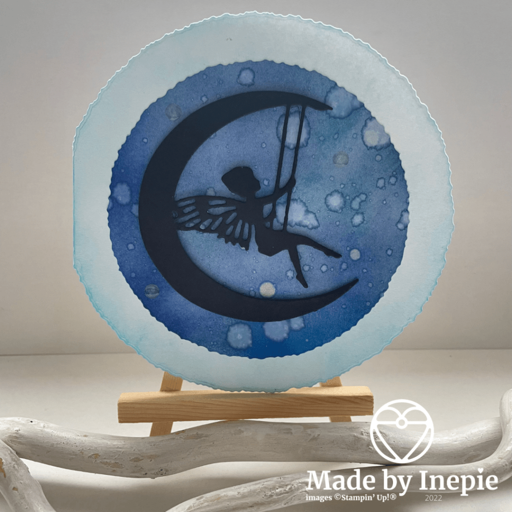 Een stansje wat ik al jaren heb liggen uitgestanst uit Basic Black cardstock en deze met mini Dimensionals opgeplakt. Wat subtiele glimmertjes erop geplakt ( retired Stampin’Up!) en mijn kaart was klaar. Ik vond het witte cardstock te wit dus heb met het beetje Tahitian Tide wat nog op mijn Blending Brush zat het mooi licht blauw gemaakt.