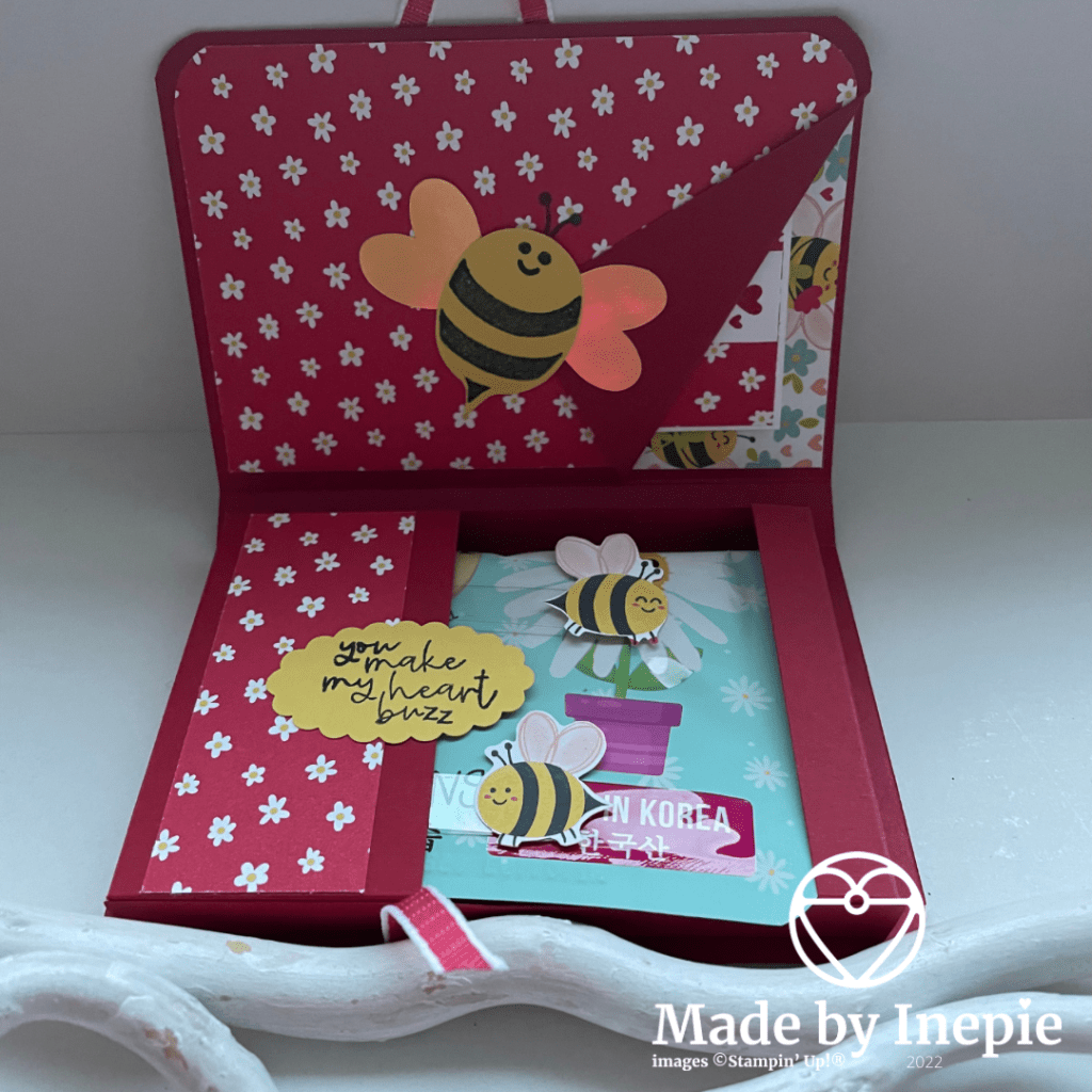 Van de week liet ik jullie mijn liggende Boxcard zien. Doordat ik niet goed had opgelet ( teveel gezellig zitten kletsen) had ik mijn Dsp verkeerd gesneden. Ik dacht dat er geen patroon in zat maar eh bijtjes die op hun kop vliegen: dat kan echt niet. Normaal plakte ik de Window Sheet strookjes aan de boven kant maar dat ging nu niet. Gelukkig reageerde Monique hier op mijn blog dat ze de liggende Boxcard ook erg lruk vond en dat volgens haar ik toch vliegende bijtjes kon toevoegen. Ik even nagedacht en ja hoor: het kon toch!
