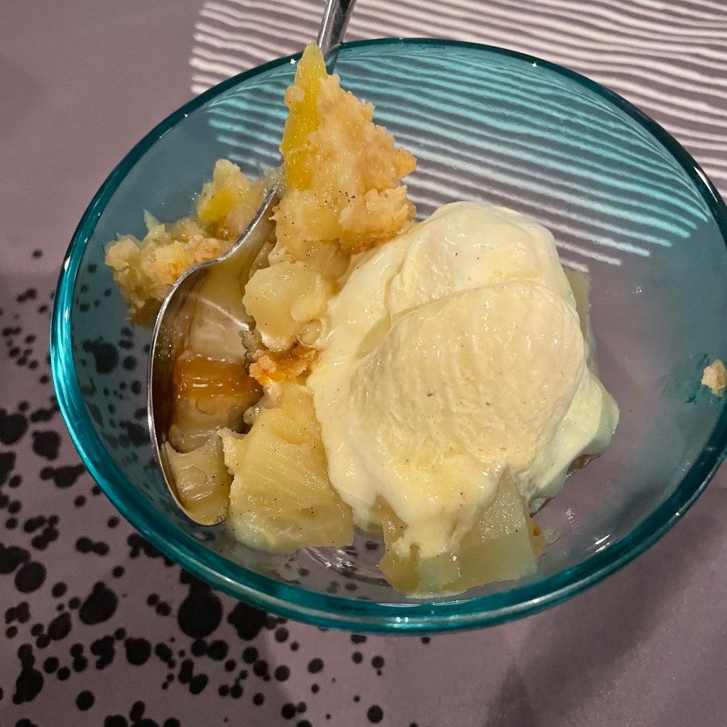 Braziliaanse Crumble: gevuld met ananas, mango en banaan. Yummie erg lekker zo warm uit de oven en daarboven op een bolletje vanille-ijs.