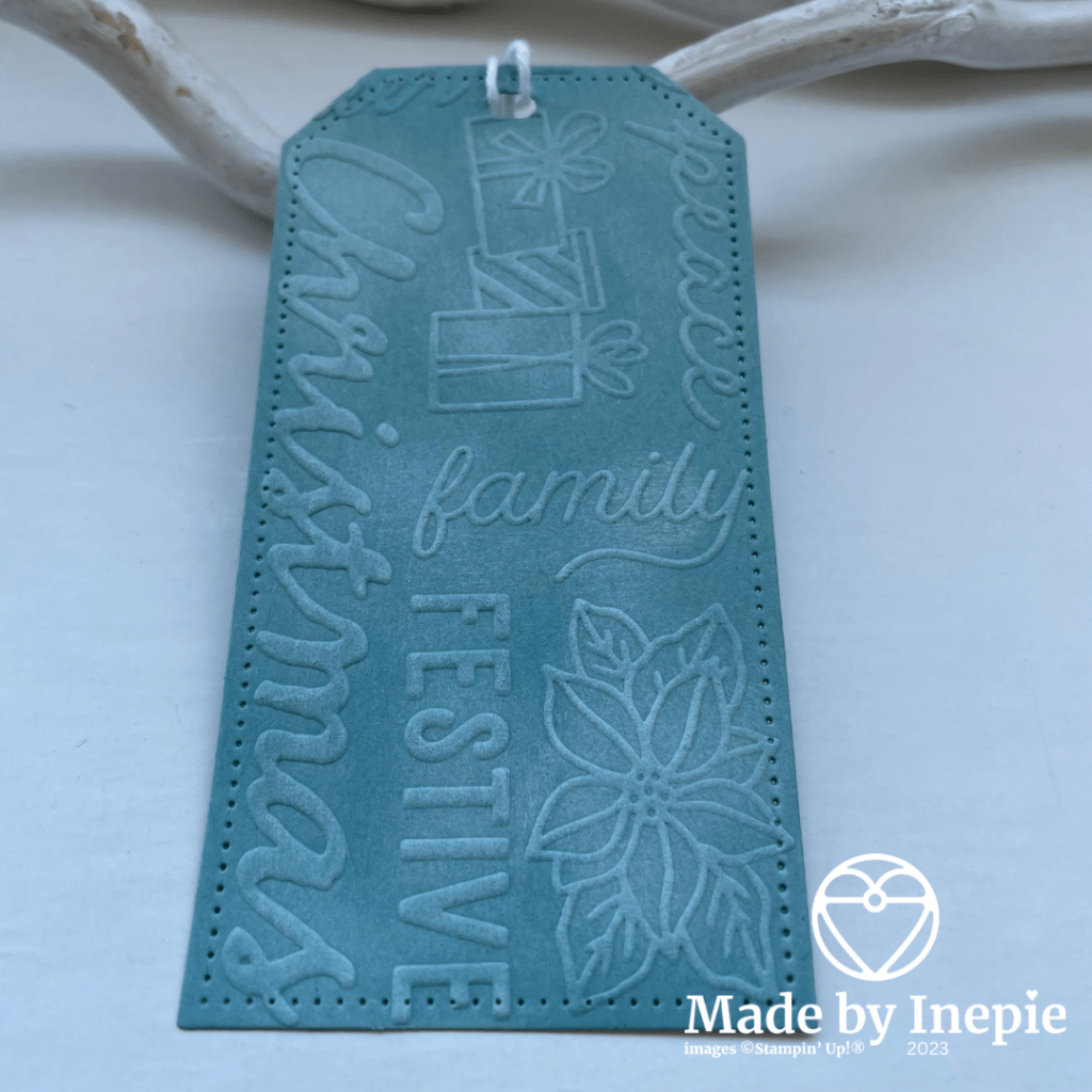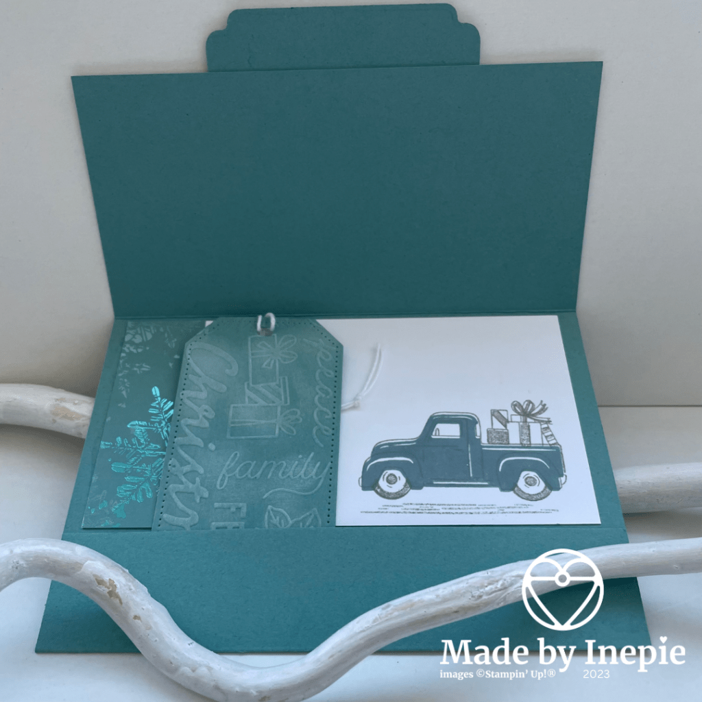 De binnenkant heb ik bestempeld met de truck en nog een stukje Dsp opgeplakt. In het zakje deze keer geen giftcard maar een label. Deze heb ik uitgestanst met de Tailor Made Tags. En daarna heb ik het label nog door de embossing Folder Kerstbegrippen gehaald.