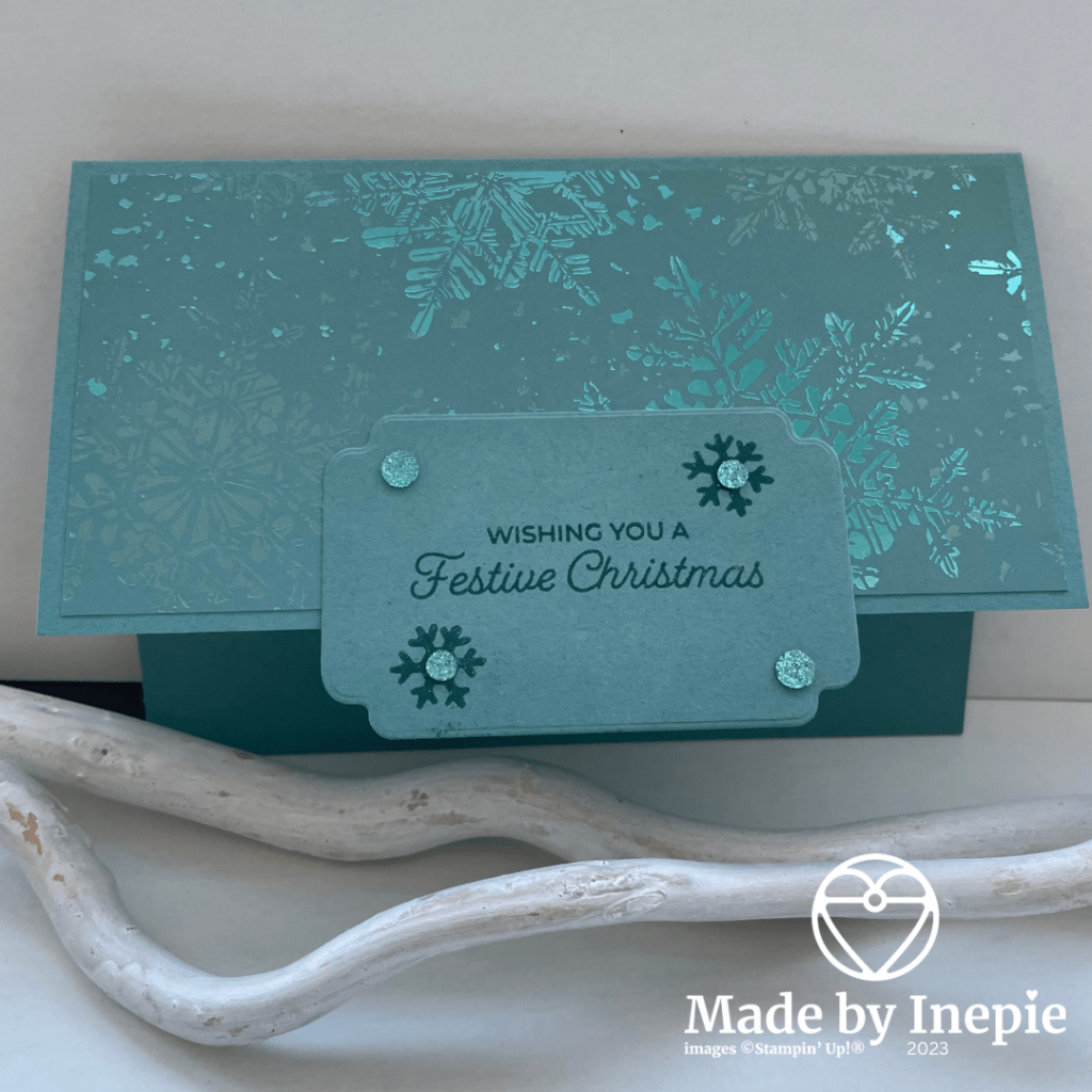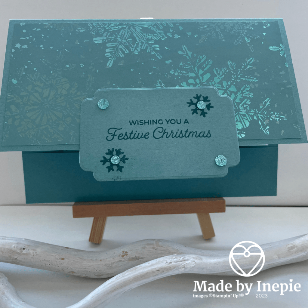Vandaag heb ik een andere kleur basis kaart genomen: Lost Lagoon en ander Dsp: Snowflake Magic specialty dsp(162147). Als er specialty voor staat betekent dat : Blingbling. Mooi Dsp met glans dus.
