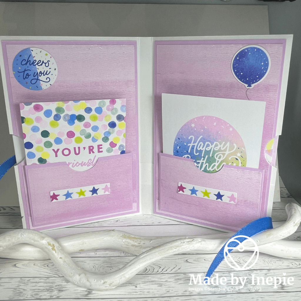 In de linker en rechterkant zitten openingen en daar had ik twee verjaardags kaarten voor gemaakt die zij naar anderen kan versturen.