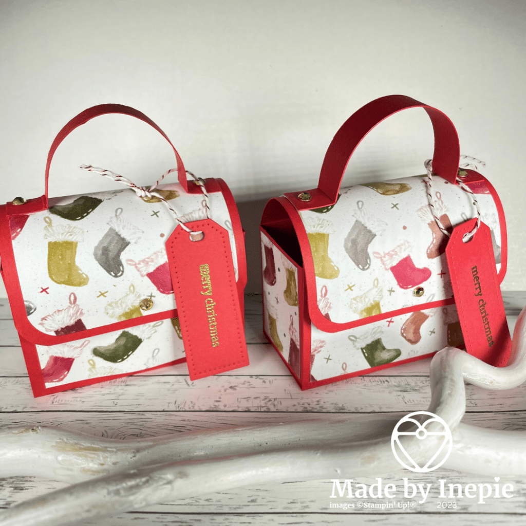 Je haalt twee basis doosjes uit 1 vel A4. De tags heb ik gemaakt met de Tailor Made Tags stansen. En heb ik met bakers Twine vastgemaakt.
