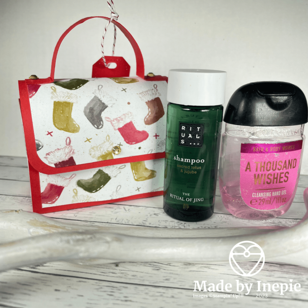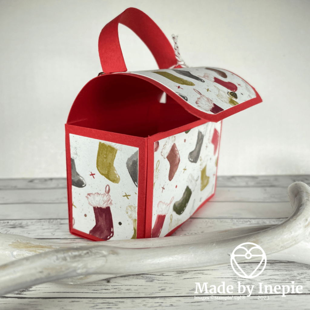 Ik gebruikte Real Red cardstock als basis en het Dsp met de schattige kerstsokjes had ik nog liggen en is retired. Maar je kunt dit met ieder Dsp maken. Je hebt maar kleine stukjes nodig.