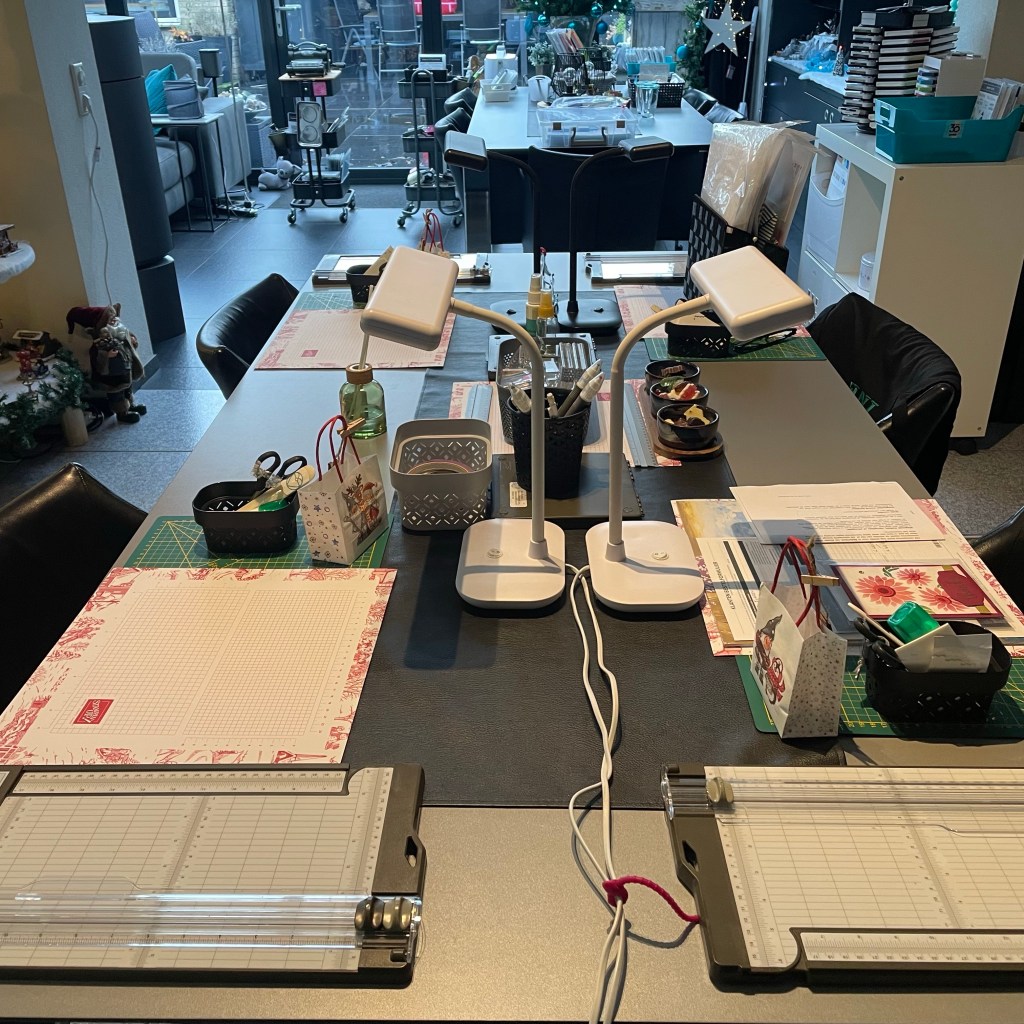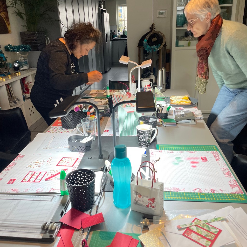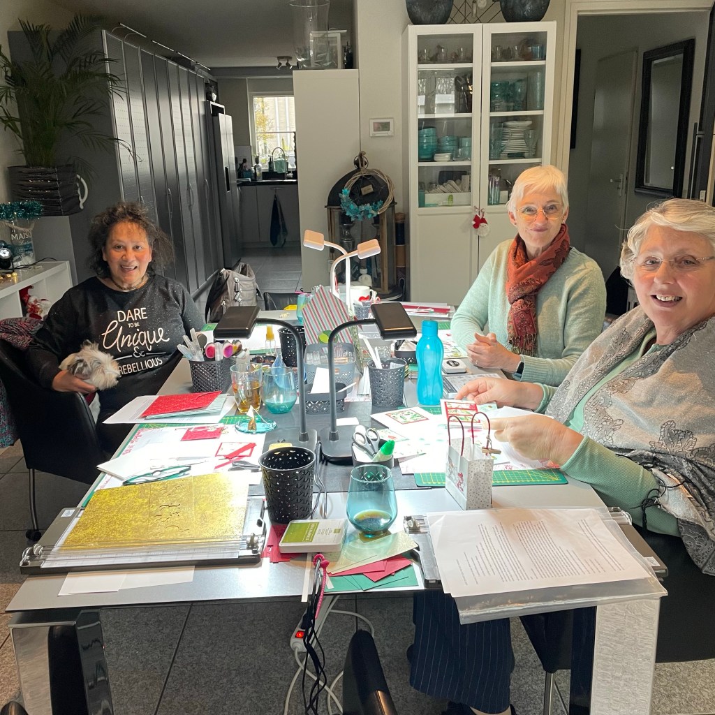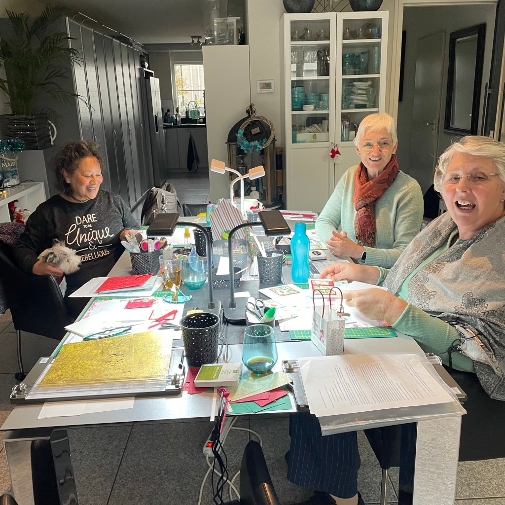 Vanochtend stonden de tafels al te wachten op de dames. Drie deze keer. Ik had 1 afzegging maar vond 3 dames wel relaxed. Zeker omdat we vandaag ook de surprise avond hadden. Mijn zus Gwen was erbij en mijn vriendin Wilma met haar zus Marga die ook al jaren naar Kerst en Kaart en workshop avonden komt. Dus twee zussen stellen. Heerlijk ontspannen gekletst en geknutseld: Genoten.