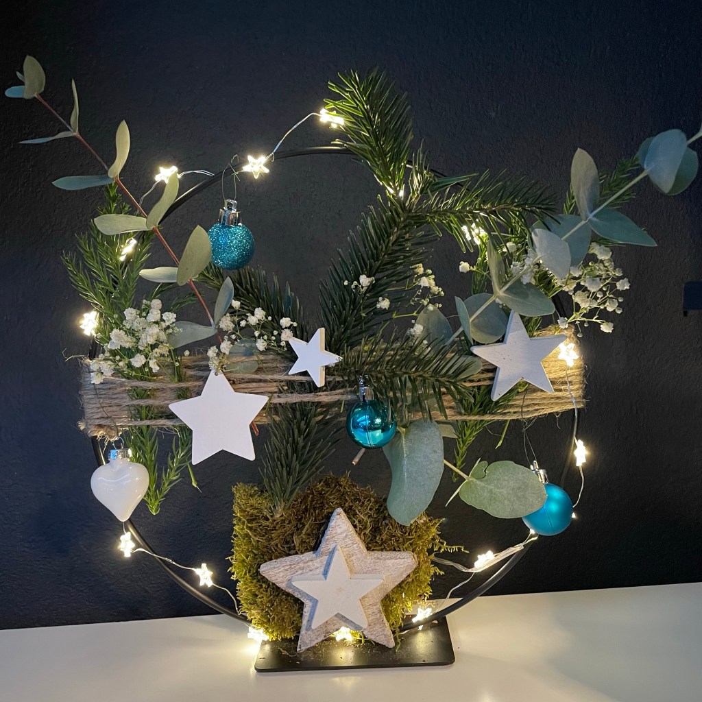 Dit is het eindresultaat: heel blij mee! Een echt Madebyinepie kerststukje. Het mos en de sterren onderop zijn om de batterij houder te verbergen.