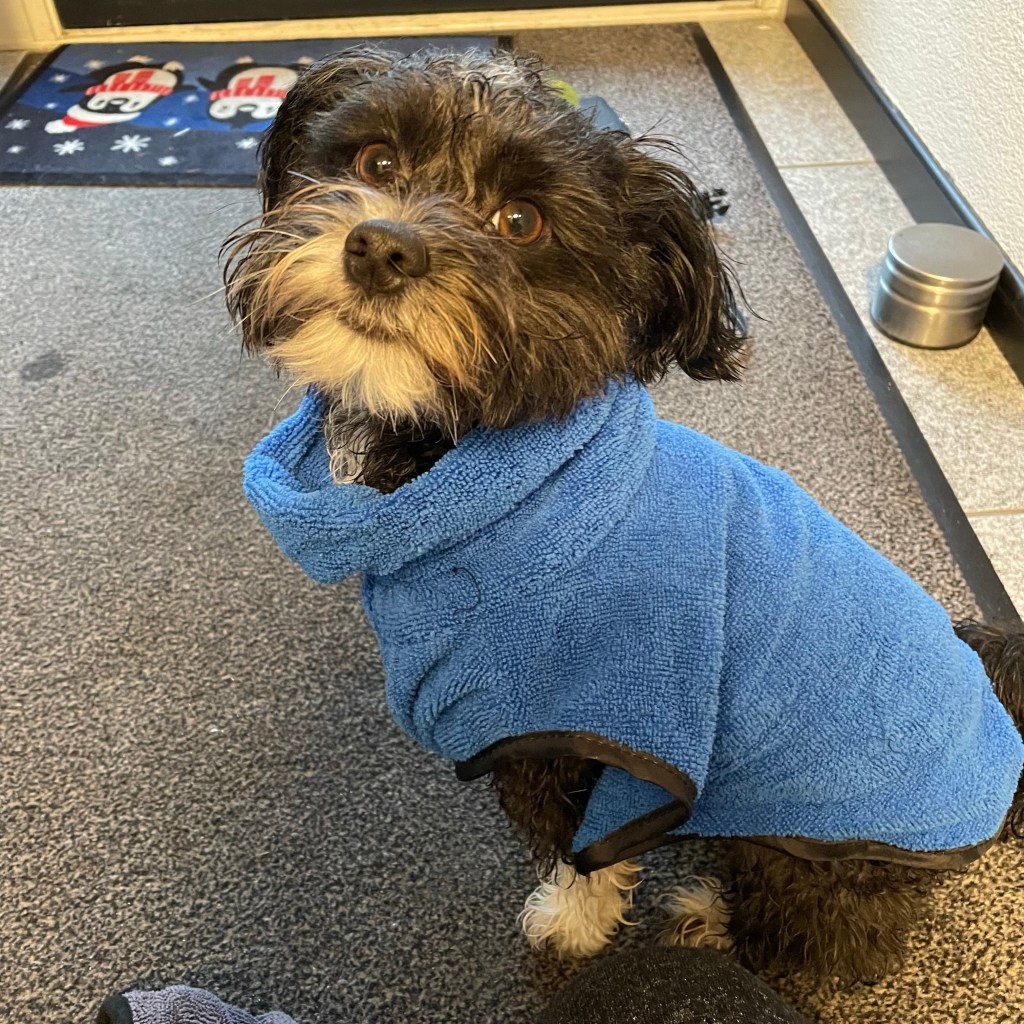 Koda en ik zijn goed natgeregend vanmorgen. Hij leek wel een verzopen katje. Dus gauw zijn badjas aangedaan.