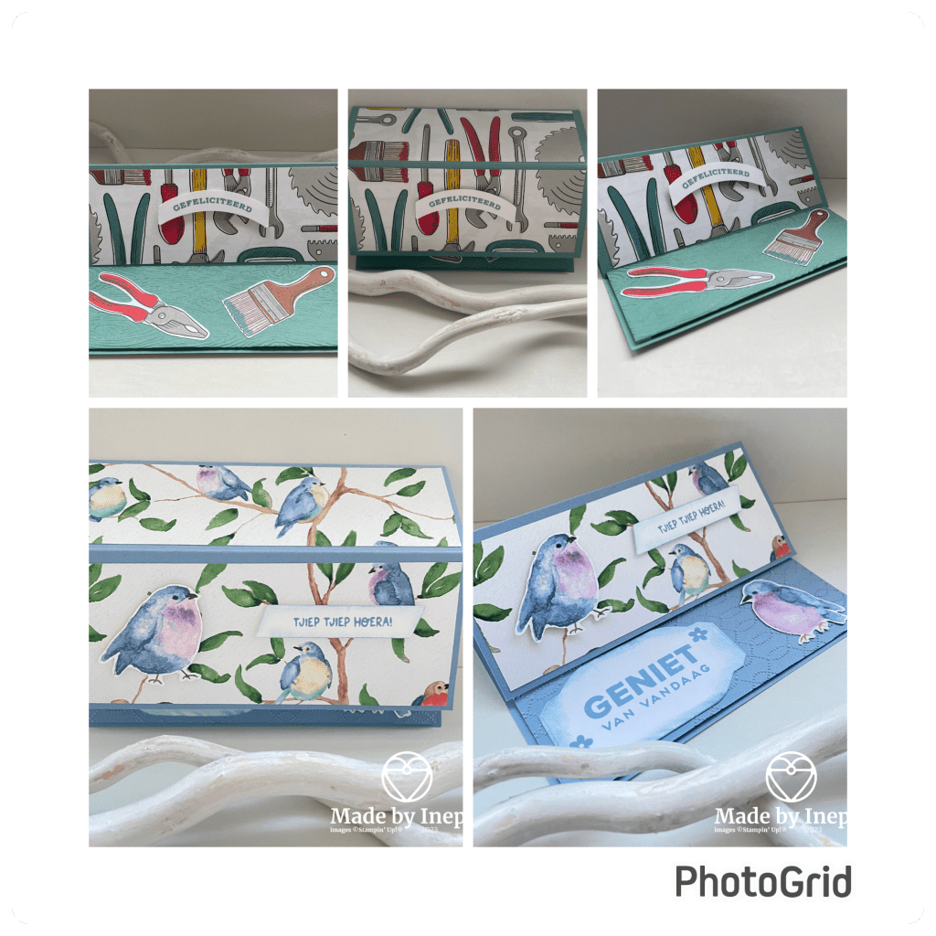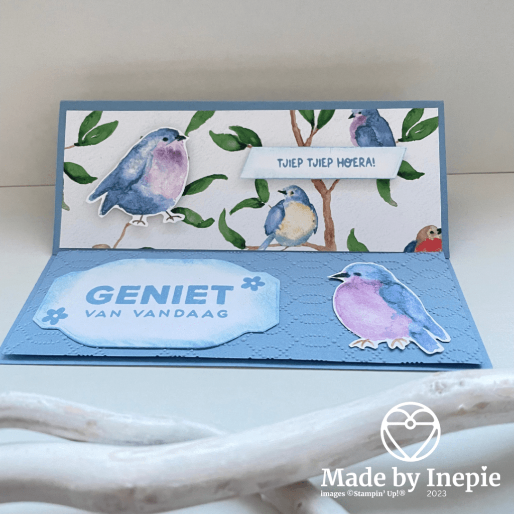 Hij kan plat in een envelop verstuurd worden maar kan zo leuk staan. Om de Sale-A-Bration te promoten had ik ook het vogeltjes papier gebruikt voor dit voorbeeld kaartje: