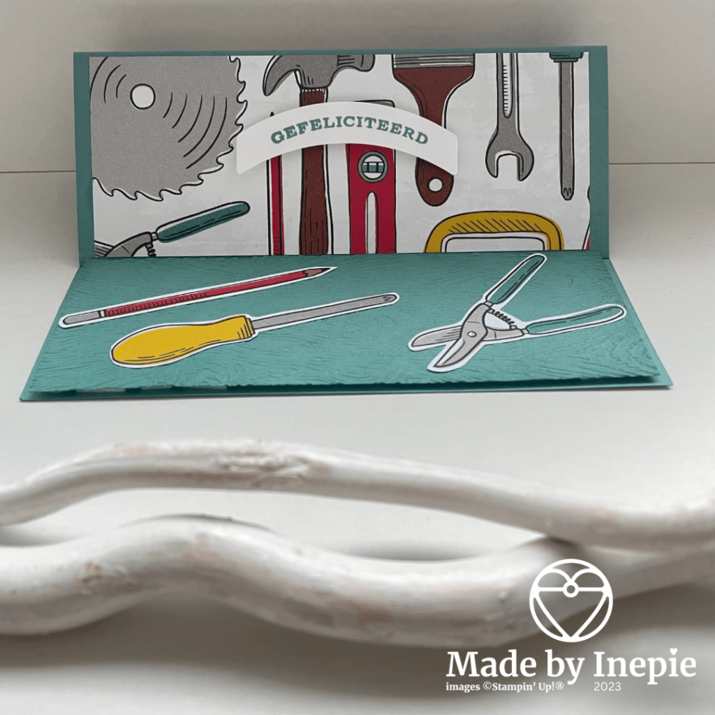 In de afgelopen periode had ik niet zoveel geknutseld. Alleen die kit in Zoutelande. Dus moest ik nog wat verzinnen voor de Koffie en Kaart. Ik had toevallig twee kaarten gemaakt omdat mijn schoonzoon jarig was en ik er 1 op voorraad wilde hebben deze heb ik dan ook gebruikt als model.