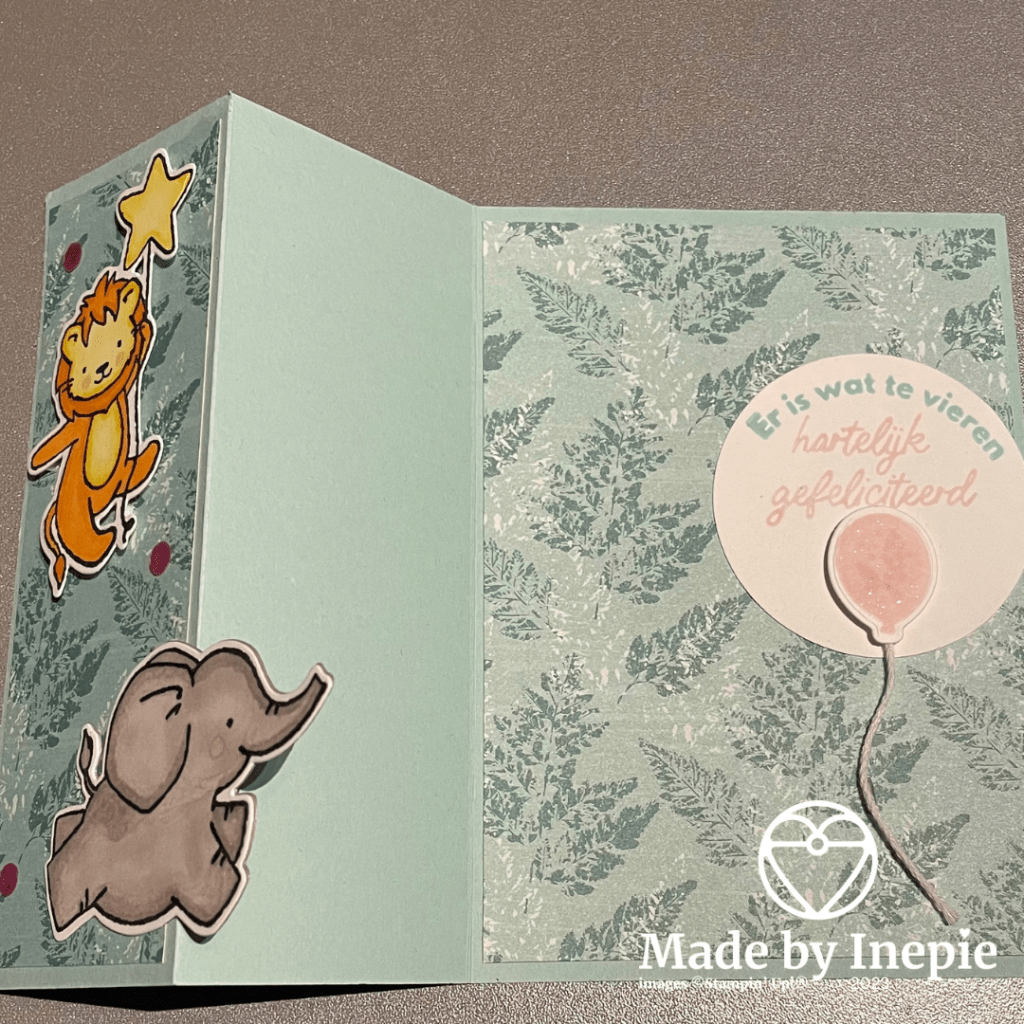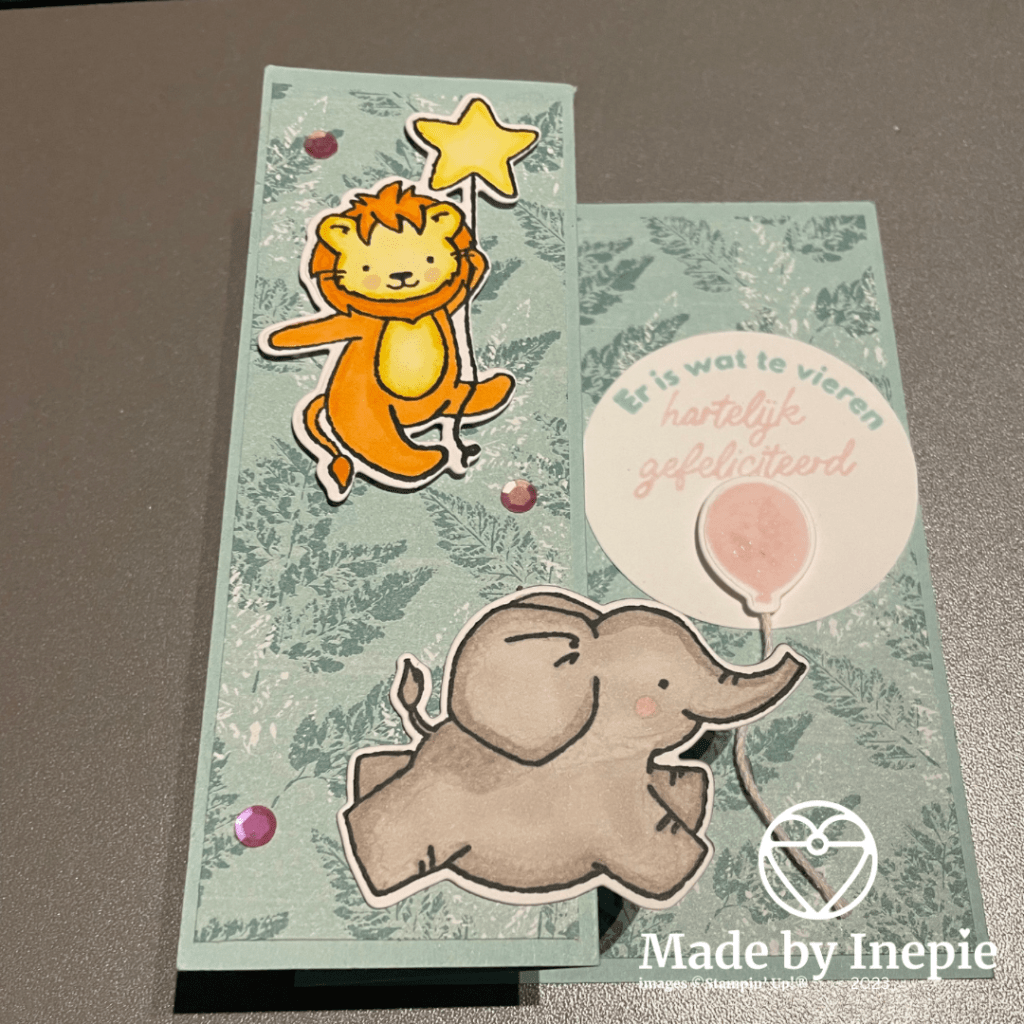 De dieren komen uit de Little Dreamers stempelset en heb ik met de bijbehorende stansen uitgestanst. De dieren heb ik ingekleurd met mijn Stampin Blends.