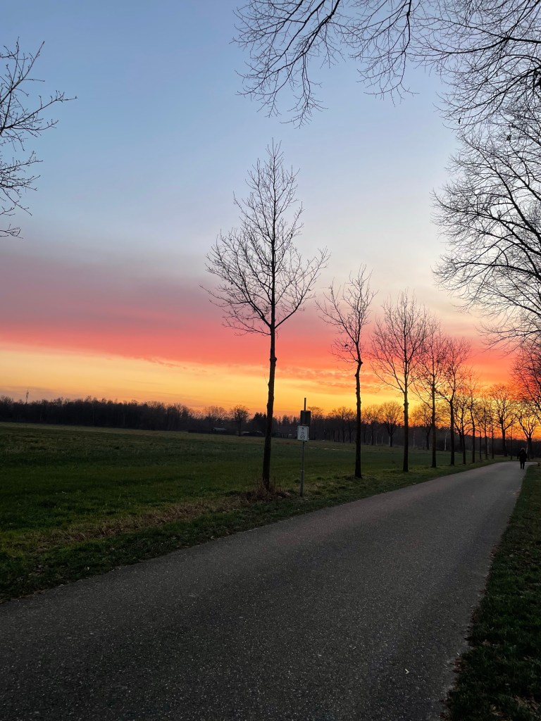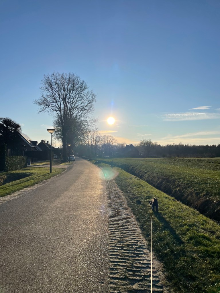 Vandaag weer heerlijk gewandeld met Koda in de zon: geniet momentje. S’middags druk bezig geweest met Stampin’up! En vanavond weer een groot geluksmomentje toen ik uit de winkel kwam en de prachtige lucht zag. Gauw doorgefietst om deze mooie foto te maken:
