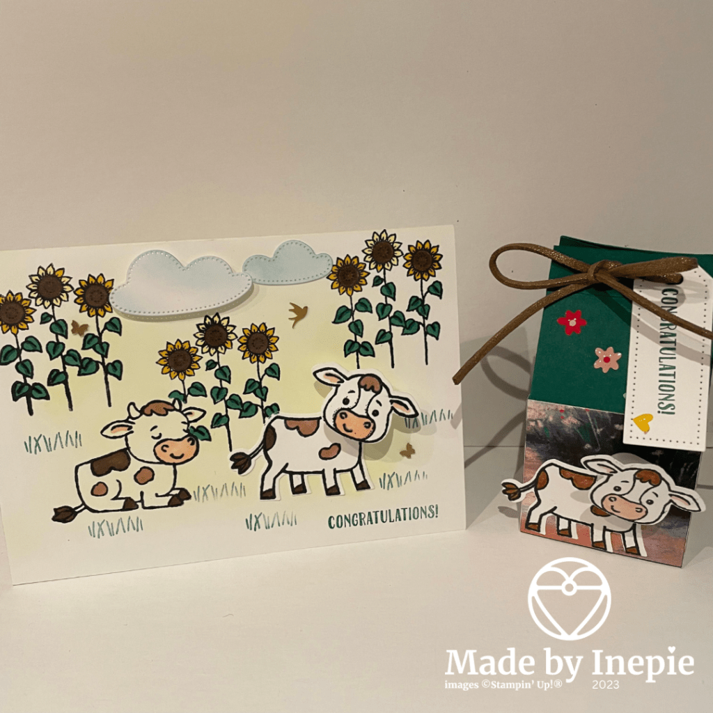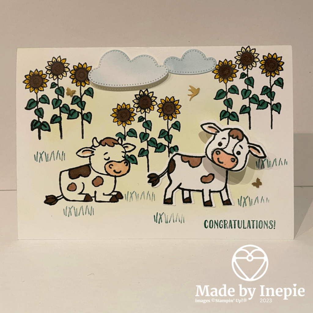 Toen op een Post-it note het lichaam van de rechterkoe uit geponst. En het hoofdje van de linker koe gestempeld op de Post-it en uitgeknipt. En de post-it figuurtjes op de betreffende onderdelen geplakt. Dit noemen wij maskeren. En toen de middelste zonnebloemen gestempeld. Als je de Post-its weghaalt staan de zonnebloemen mooi achter de koetjes en niet over de koeien heen. Heerlijk ontspannen zitten kleuren. Gras gestempeld en vlinders en een vogeltje opgeplakt. De wolken komen uit de Little Dreamers stansen set. En deze heb ik met een mini Blending brush en Balmy Blue inkt wat kleur gegeven. Eentje zo opgeplakt en de andere met Dimensionals. Schattig kaartje toch?