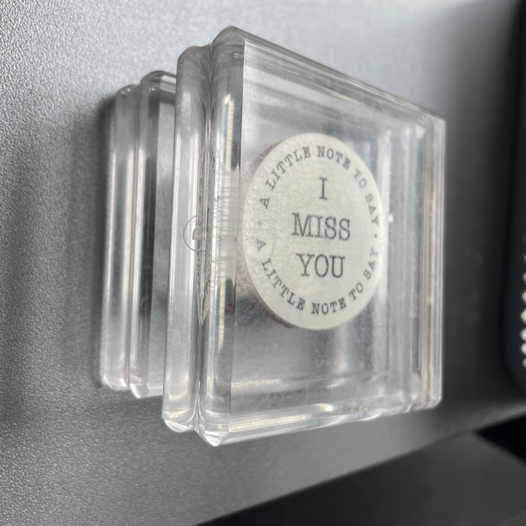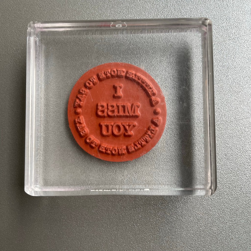Bij deze ronde tekststempels is het moeilijk om te zien hoe je de sticker erop moet plakken. Hier is mijn tip: leg de stempel goed neer op een acryl blok. Door dat het blok doorzichtig is kun je zo goed zien dat de tekst recht staat.