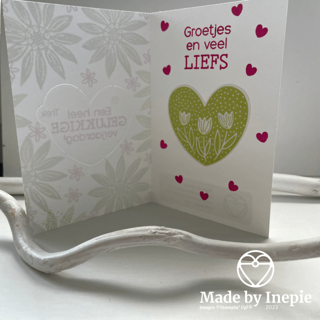 Aan de binnenkant heb ik op dezelfde plek een gestempeld en uitgestanst hartje geplakt. En kleine hartjes gestempeld.