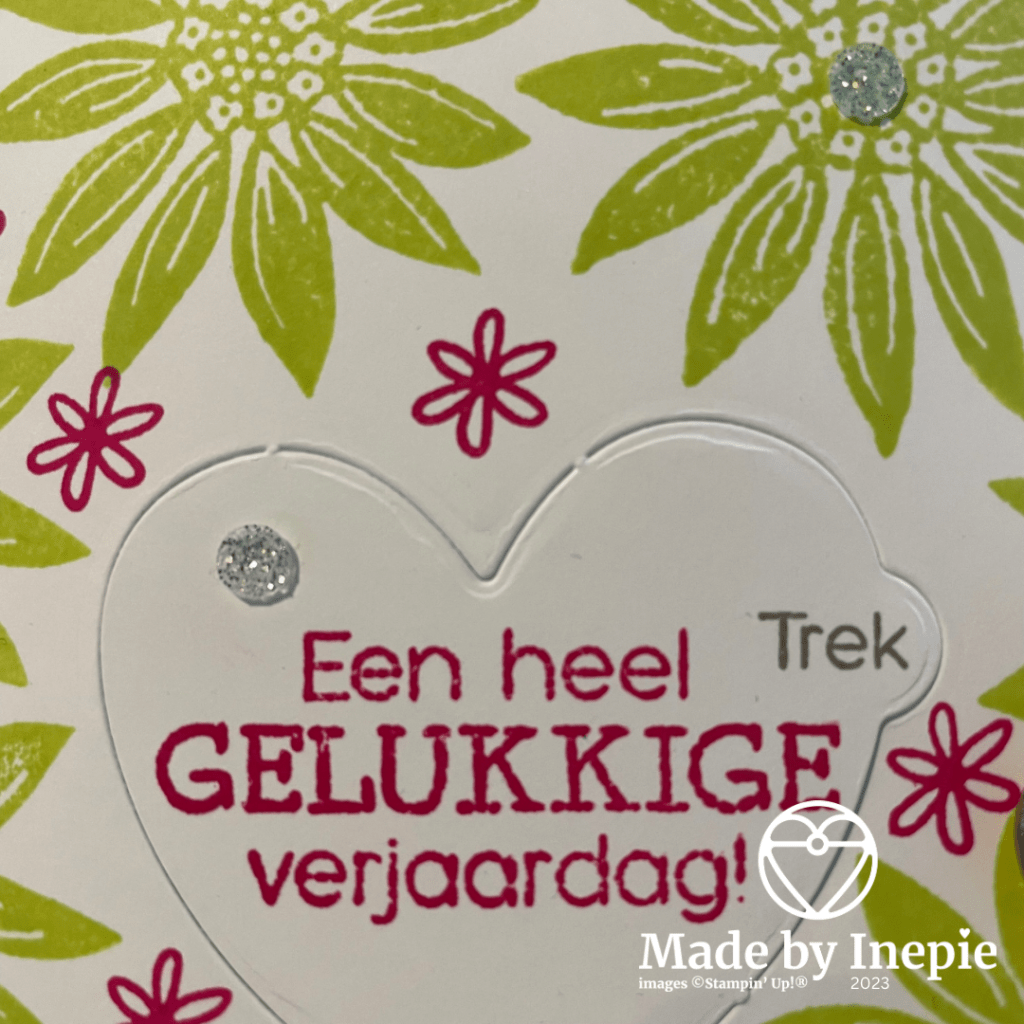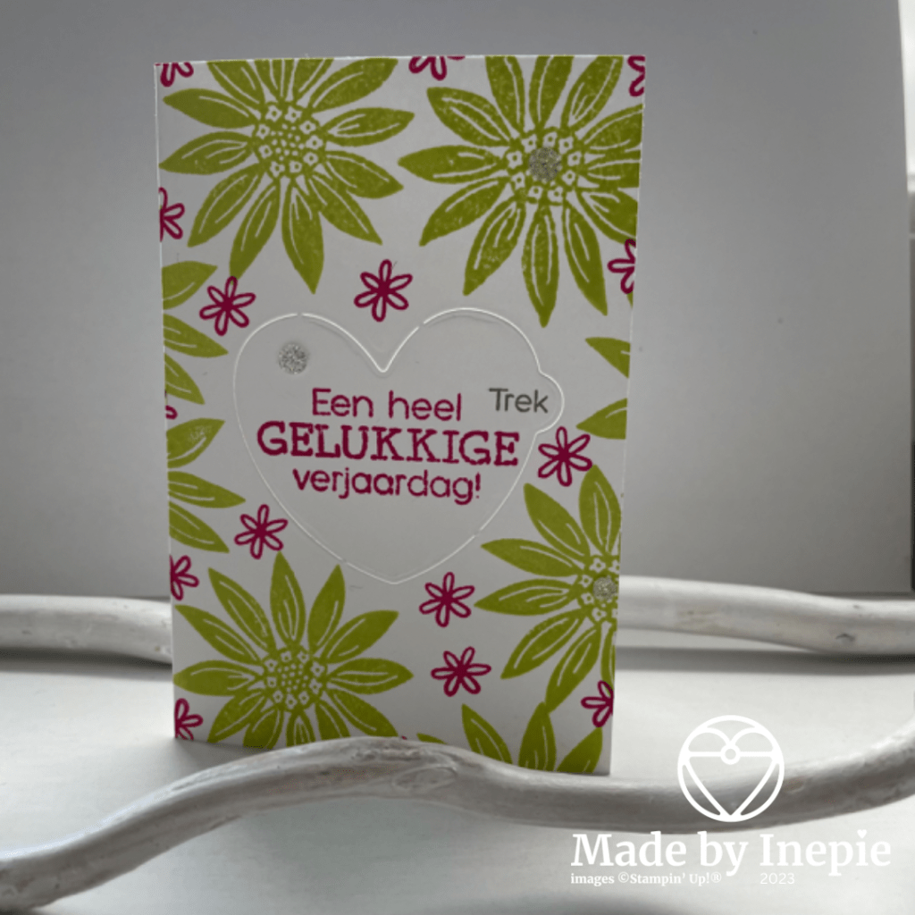 Ik heb eerst de stans met het hartje in het midden van een basiskaart gebruikt. Hij snijdt dus het hartje niet los maar zit op een paar plekken nog vast. Daarna lekker los uit de pols de bloemen gestempeld.