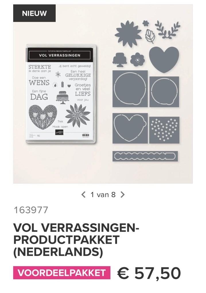 Vandaag laat ik jullie een kaartje zien die ik gemaakt heb met de bundel Vol Verrassingen. Mooie Nederlandse teksten, leuke afbeeldingen in de stempelset. Maar de stansen zijn echt een verrassing. Hiermee creëer je doorkijkjes. De ontvanger trekt dan aan een lipje en daarachter zit dan een verrassing.