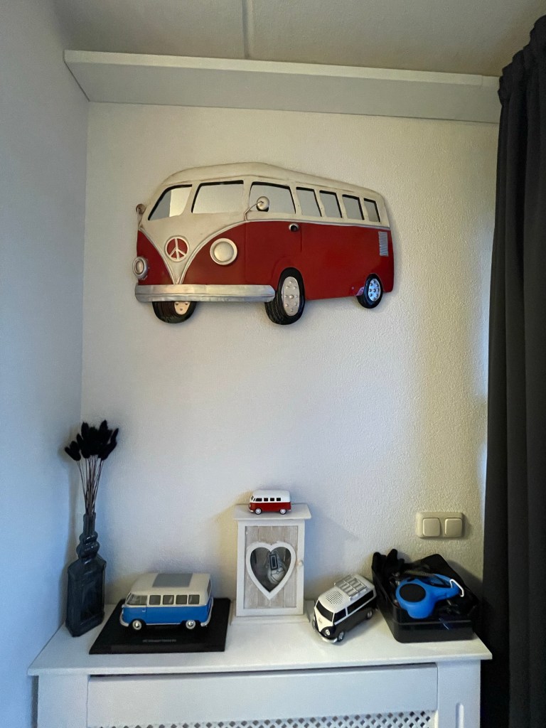 Aan de muur vond ik de rode bus erg mooi. Deze heeft Willem jaren geleden van mij gekregen samen met twee metalen VW kevertjes. Die hingen op de slaapkamer maar nu dus de bus naar beneden verplaatst. En mijn Boedah met glas mozaïek en de kleine boedah beeldjes zijn dus naar boven naar onze slaapkamer verhuisd. Willem en ik zijn beide blij met het eindresultaat.