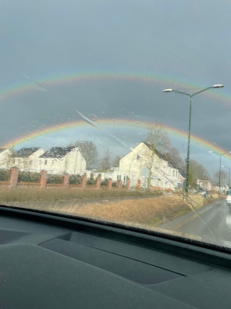 Op weg naar de verjaardag van Bibi zagen Gijs, Michael, Willem en ik deze prachtige dubbele regenboog. Zo duidelijk en zo mooi: echt een geniet- en geluksmomentje! De verjaardag was erg gezellig en daarna met de jongens thuis frietjes gegeten. Daarna de koffers en packing cubes meegegeven want 4 maart vertrekken ze naar Canada en Amerika. Drie en halve week zijn ze weg: mooie vakantie!