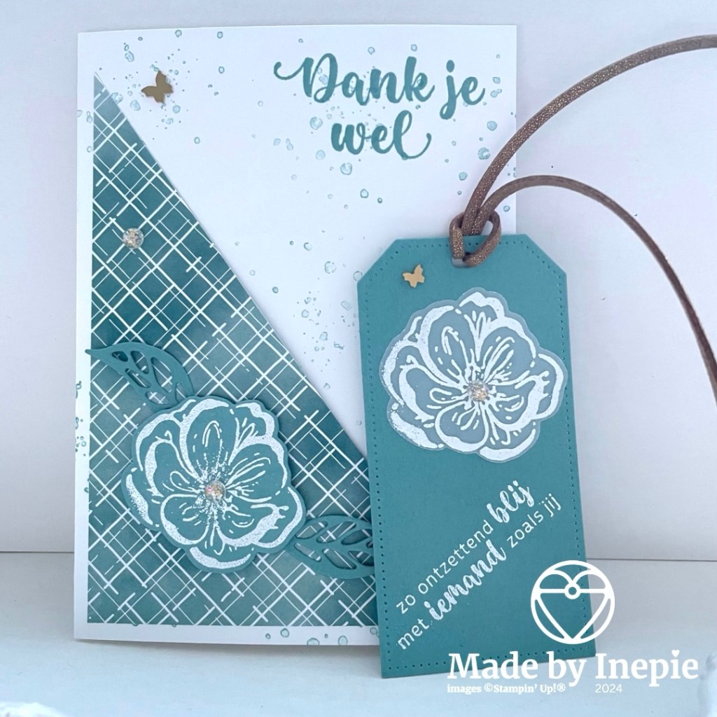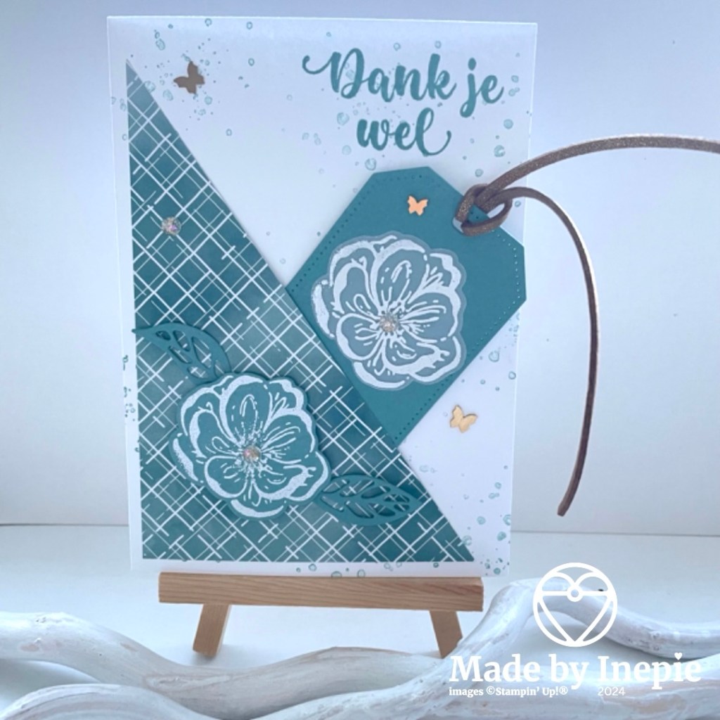 Het stuk Dsp heb ik links en onder van wat lijm voorzien zodat je een vakje creëert. Hier heb ik een label ingestopt. De bloemen heb ik met wit Embossingpoeder ge-heat embossed. 1 Op vellum en de andere op een reststukje Lost Lagoon cardstock. En ze daarna uitgestanst. Ook de tekst op het label is ge-heat embossed. Maandag had Karin, 1 van de dames van Koffie en Kaart voor de eerste keer ge-heat embossed en dat ging super. De 1 vindt dit moeilijk en de ander simpel.