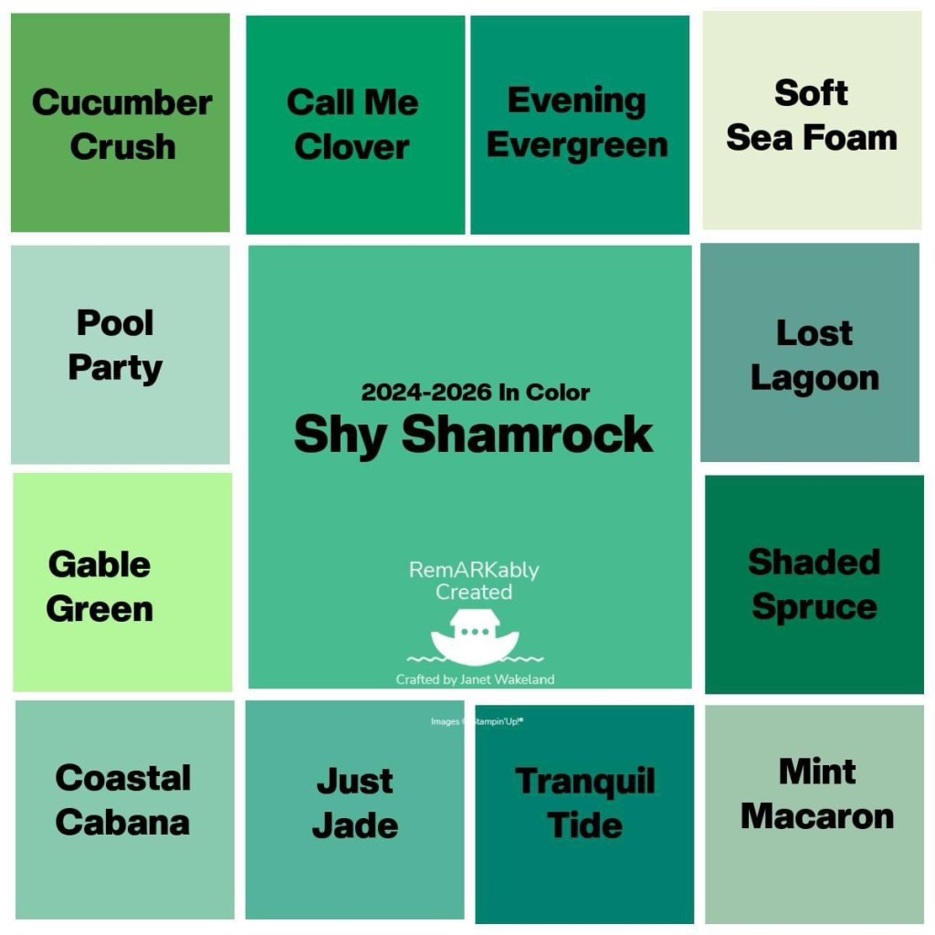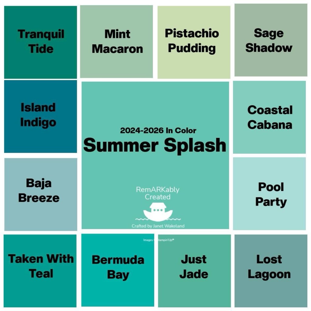 Summer Splash 😍. Een mooie kruising tussen Bermuda Bay en Coastal Cabana. In het middelste vlak staat de nieuwe kleur en eromheen kleuren ( ook sommige die retired zijn) die er bij passen of op lijken. Ik heb deze foto’s van Janet Wakeland.